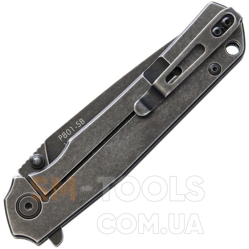 Главным отличием данной модели от «базового» P801 является оригинальная окраска клинка и рукоятки. На их поверхность было нанесено матовое покрытие черного цвета, а затем нож отшлифован методом Stonewash, благодаря чему удалось создать оригинальный «потертый» дизайн.