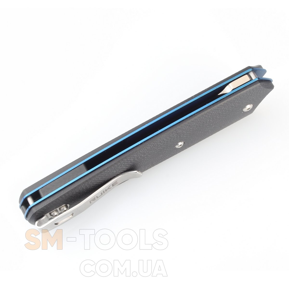 Рукоятка ножа Ruike P848-B состоит из нескольких частей, а именно, из пары стальных лайнеров (нержавеющая сталь марки 420 + титановое покрытие синего цвета) и двух накладок из G10 черного цвета. Качественная отделка и тщательная подгонка комплектующих друг к другу позволили сделать рукоять максимально цельной и удобной для пользователя. А текстурированная поверхность накладок из G10 не даст ножу ускользнуть из рук при эксплуатации.
