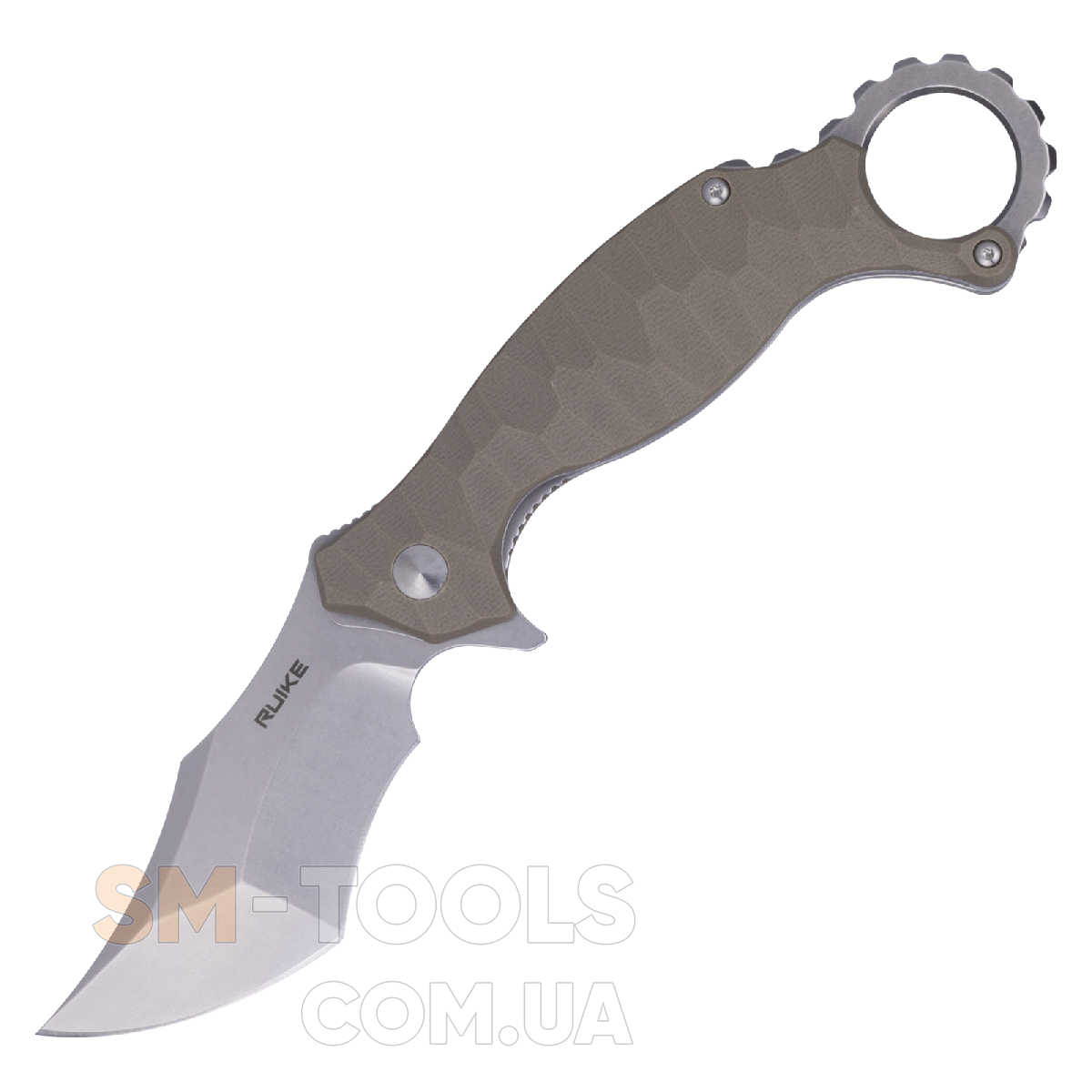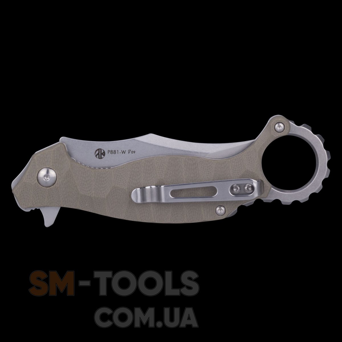 Это можно отнести и к новинке Ruike P881-W. Складной керамбит имеет темно-бежевый цвет рукояти и длину в раскрытом виде 20,2 сантиметра. Окрас ножа неоднородный, с рисунком. Модель имеет удобную металлическую клипсу, которая позволяет крепить нож на одежду или, например, на рюкзак. У изделия имеется целый подшипник и замок по типу Liner lock. Этот замок защищает нож от случайного открывания или случайного закрытия. Очень безопасный и надежный механизм, значительно упростивший использование ножей. В итоге открывать и закрывать модель можно практически одной рукой.