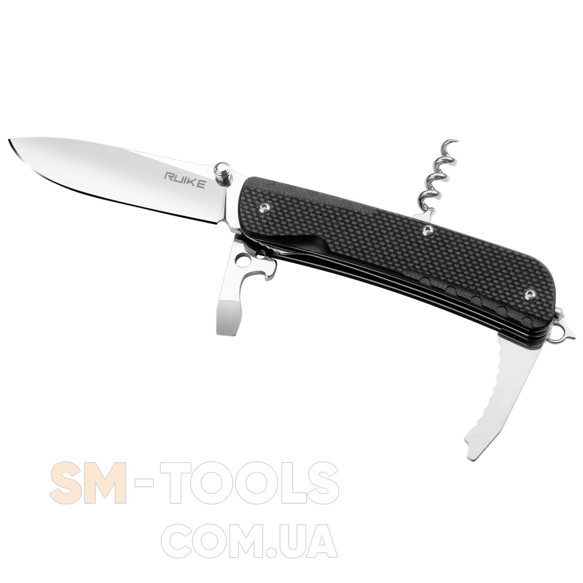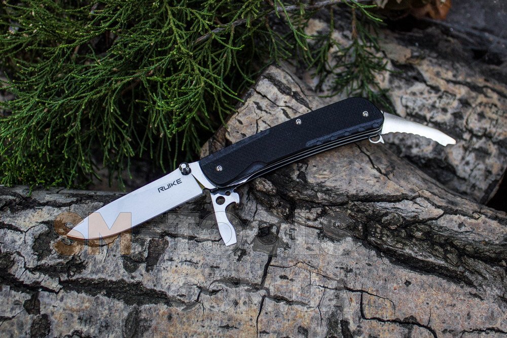 Все инструменты Ruike LD-21 изготавливаются из шведской стали 12C27, выплавляемой в Швеции. Они гладко отполированы, а потому чем просто отлично смотрится. Главный инструмент модели Ruike LD-21 – это хорошо заточенный нож, длина которого составляет 85 мм. Клинок достаточно прочный, поскольку его толщина – 3 мм. Твердость металла ножа составляет 58-59 HRC.