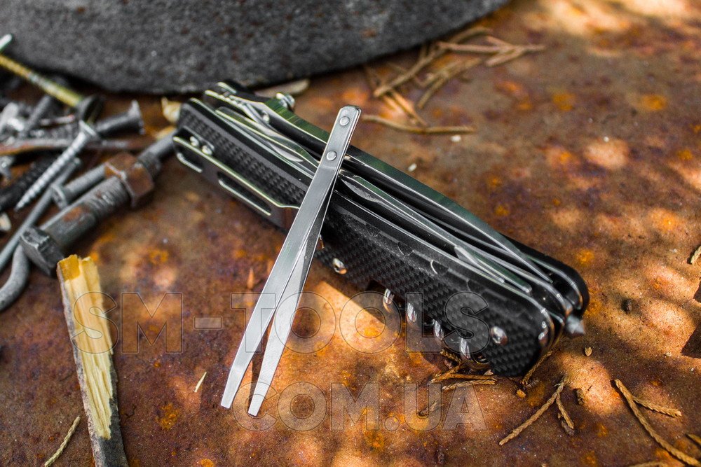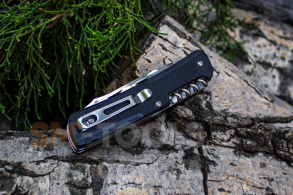 Дополнительные инструменты помещаются с разных сторон рукоятки и достаются из нее по мере необходимости. Это штопор, две прямые отвертки разного размера, приспособление для зачистки проводов, стеклобой, лезвие с волнистой заточкой для разрезания волокнистых материалов. Кроме того, в торце ручки ножа имеется небольшое стальное кольцо, чтобы этот нож можно было носить вроде брелока. Впрочем, стандартная прижимная клипса тоже есть.