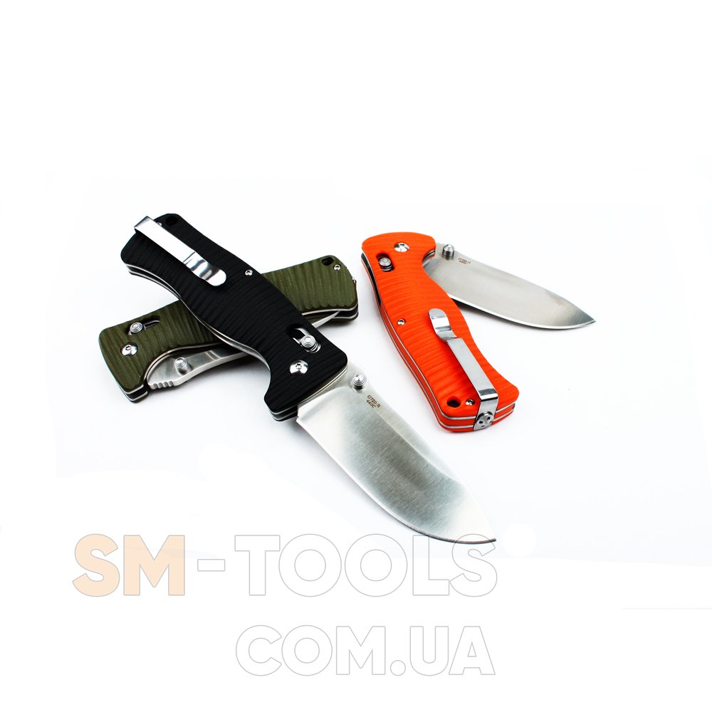 Для накладок на рукоятку ножа производители использовали современный вид пластика высокой прочности под названием G10. По сути, он представляет собой композитный материал из эпоксидных смол и стеклоткани. Этот материал обладает высокой прочностью, хорошо выдерживает ушибы, противостоит влаге и долгое время сохраняет яркий цвет. Рукоятка ножа Ganzo G720 неровная. Такая форма одновременно играет роль элемента дизайна и способствует надежному удержанию.