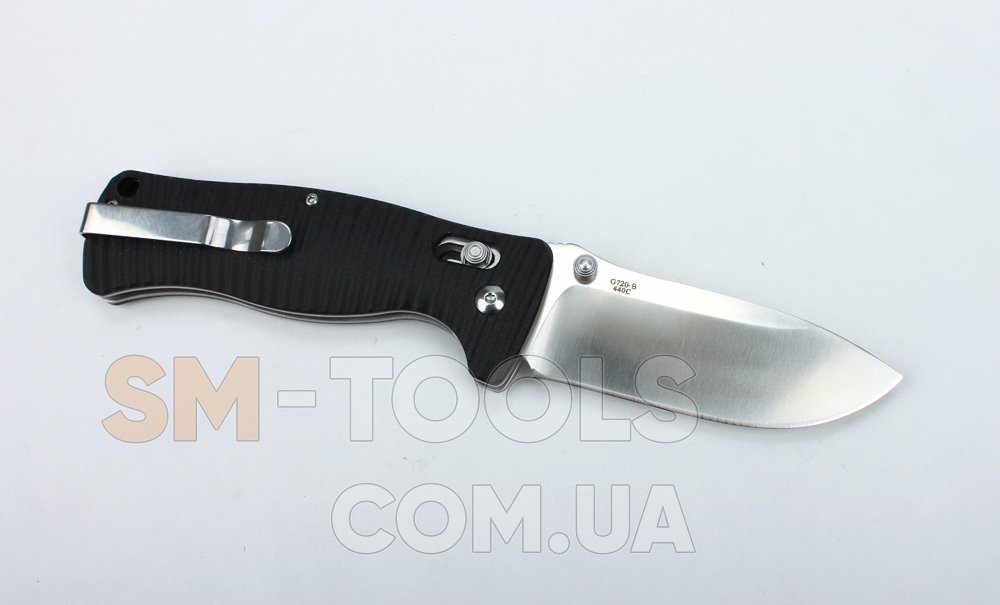 Складной нож Ganzo G720 в сложенном состоянии имеет длину всего 12 см, поэтому легко поместится в кармане. Клинок этого ножа получил заточку прямого типа. Его длина составляет 9 см, толщина со стороны обуха – 0,4 см. В качестве материала для ножа производители выбрали стойкую к коррозии хромистую сталь марки 440С. Ножи из такой стали легко затачиваются и долго остаются острыми. Твердость клинка в модели ножа Ganzo G720 оценивается в пределах +-58HRC.