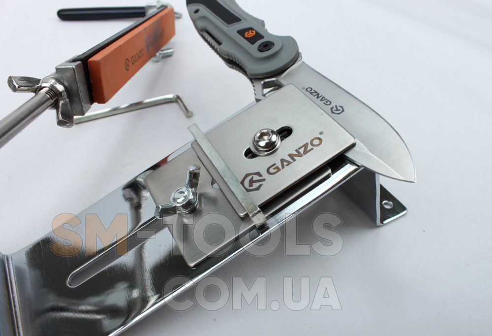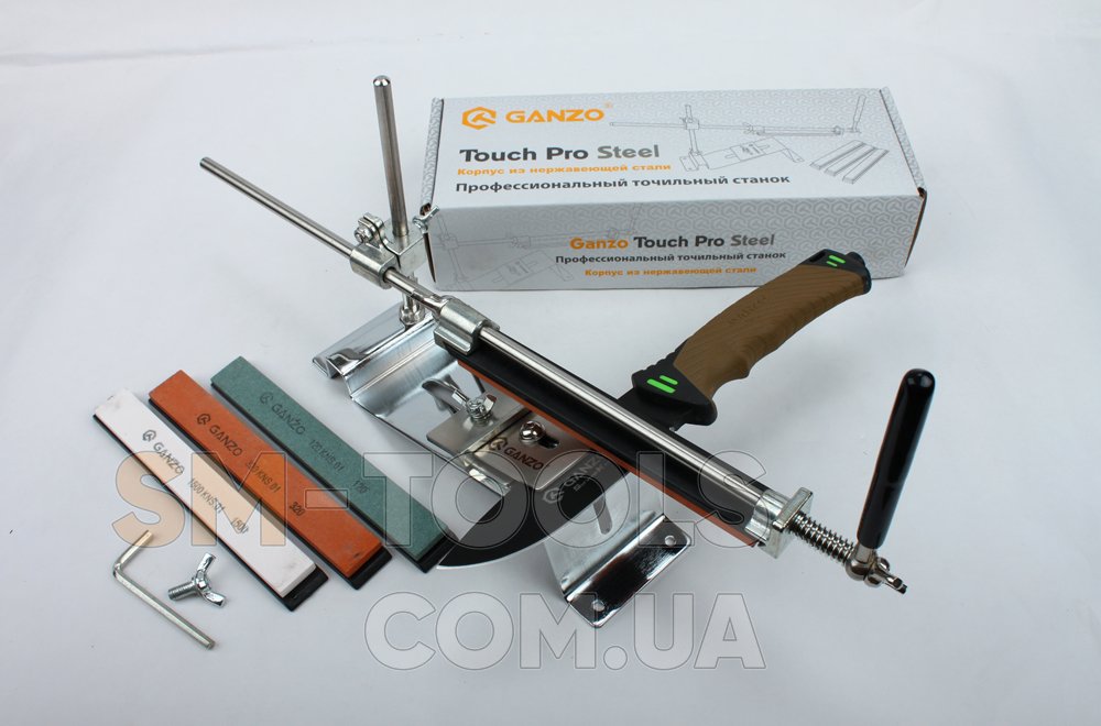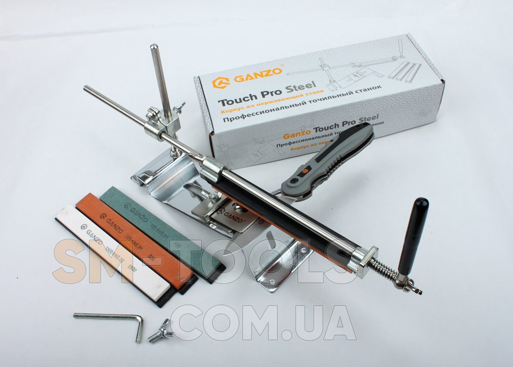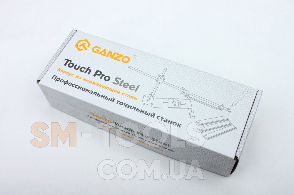 На відміну від інших точілок Ganzo, модель Ganzo Touch Pro Steel — повністю металева, що підвищує її міцність і довговічність. Крім того, під час заточування, клинок можна зафіксувати в потрібному положенні за допомогою сталевої направляючої пластини. Ця особливість гарантує повну безпеку для користувача під час заточування ножа, але й накладає певні обмеження. Металеві деталі можуть залишити дрібні подряпини на поверхні ножа. Тому перед заточуванням рекомендується наклеїти на клинок з обох сторін малярську стрічку, ізоляційну стрічку або будь-яке інше захисне покриття, яке зможе захистити лезо від прямого контакту з металом направляючої пластини і підстави.