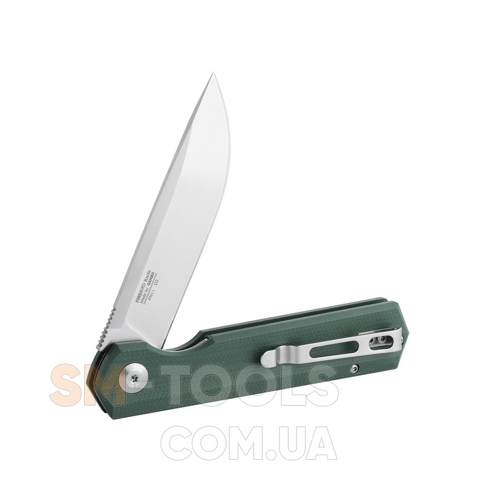 У моделі Firebird FH11 немає двостороннього шпенька або спеціальної кнопки для відкриття. Лезо витягується за допомогою спеціального «плавця», що є частиною самого клинка. У відкритому вигляді ця ж деталь виконує роль своєрідної гарди, захищаючи долоню користувача від випадкового зісковзування. А от фіксація ножа у відкритому вигляді здійснюється за допомогою замка Liner-lock.