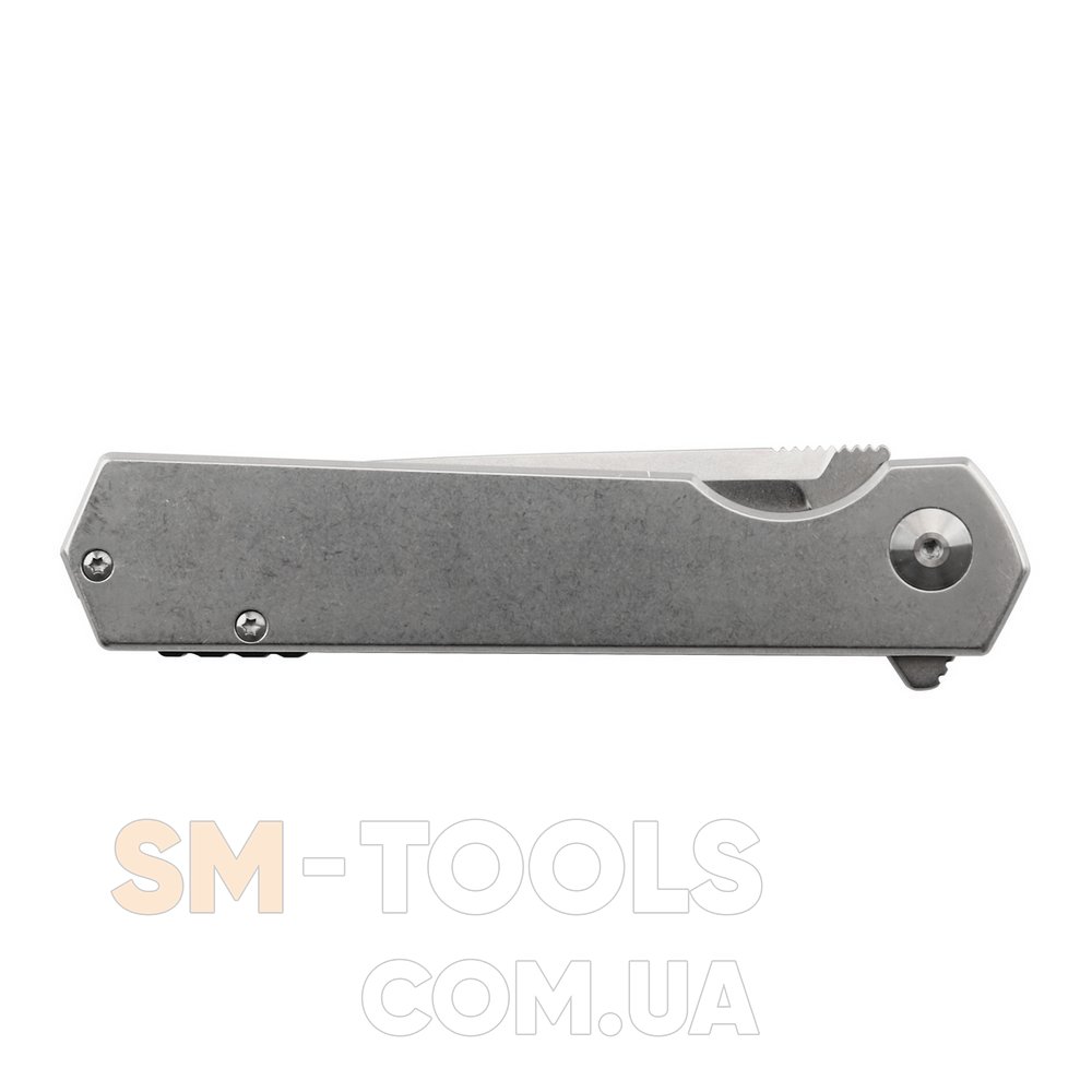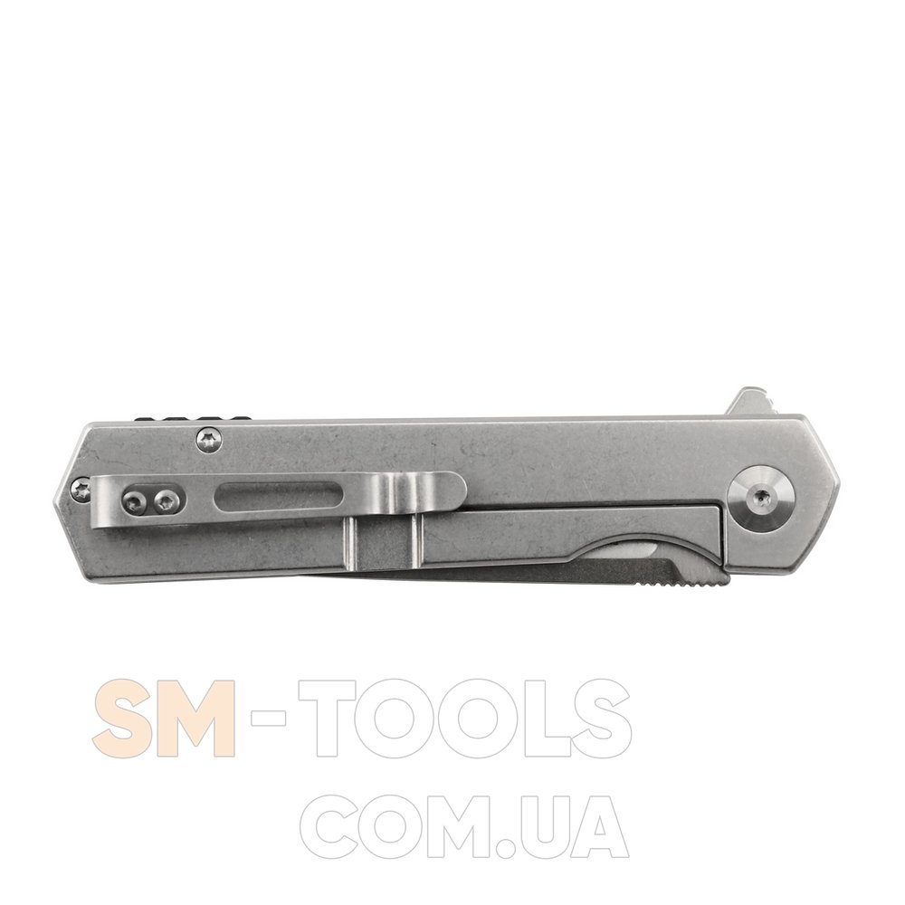 Метал для форматування рукоятки використовується інший – нержавіюча сталь. Щоб ніж зручно лежала в руці і не ковзав, у його ручки прямі обриси з невеликою виїмкою для пальців знизу. А носити його в кишені найзручніше, закріпивши для надійності металевої кліпсою, прикрученою з однією з сторін рукоятки. За бажанням власника, цей елемент можна переставити на іншу сторону.