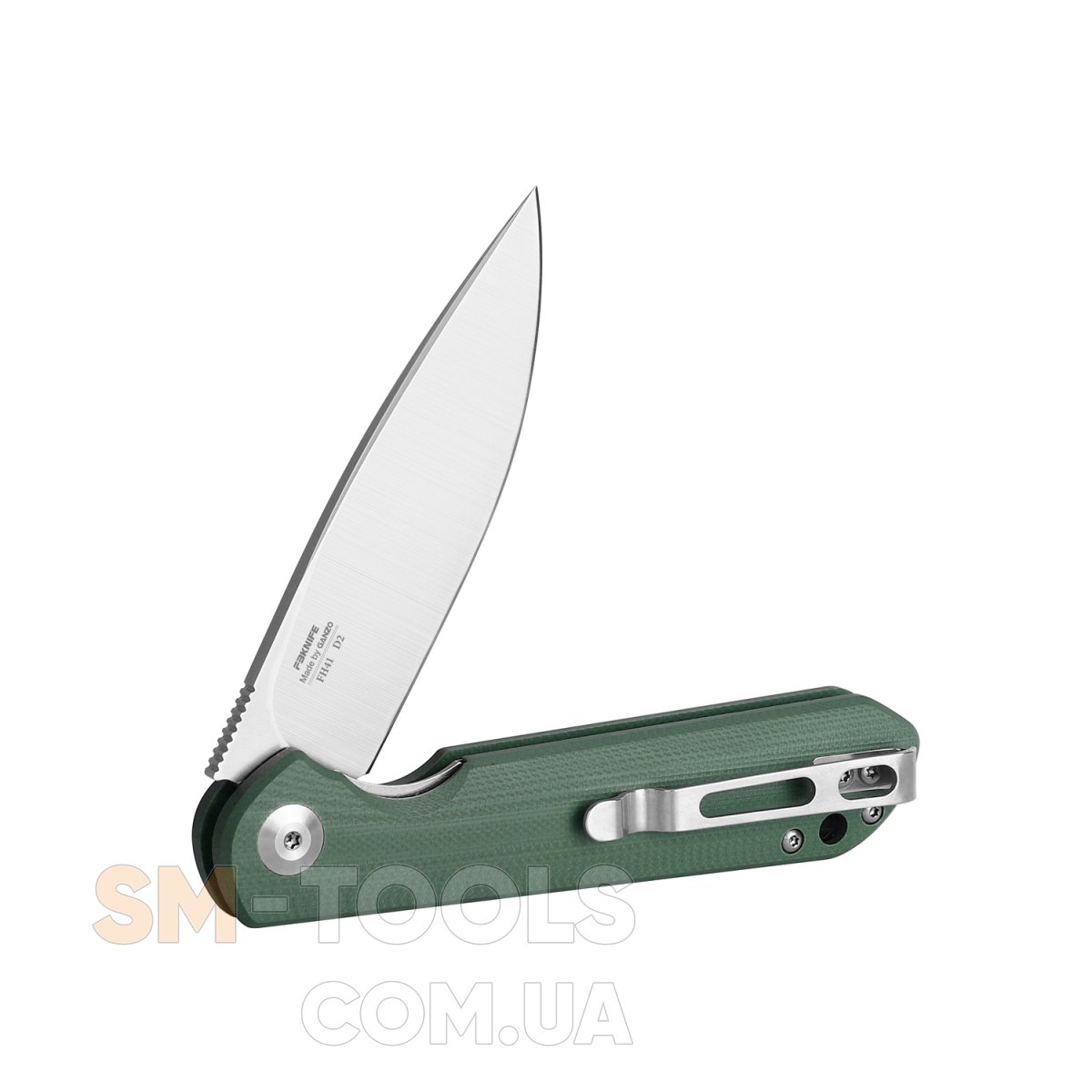 Ніж FH41 відразу сподобався всім, як тільки з'явився на ринку. Він універсальний і міцний, виробник продумав кожну дрібницю. Форма клинка класична – drop-point, з приспущеним до вістря обухом. Виготовляється він із високоякісної сталі D2 з твердістю 60 HRC. Фіксує клинок у закритому і відкритому положенні механізм Flipper, який показує високу надійність.