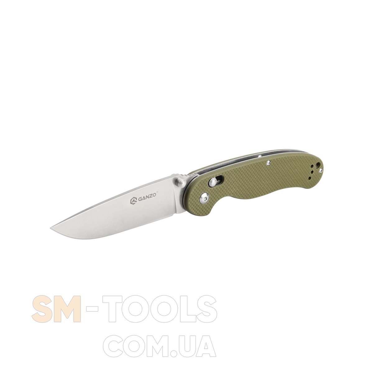 Лезо ножа зроблено з нержавіючої сталі, що також великий плюс для ножа, який використовується на природі. У даній моделі використовується марка сталі D2, яка крім високої опірності корозії відрізняється ще й досить великою твердістю (60 одиниць Роквелла). Заточений ніж гладко, що дає можливість різати ним практично будь-які продукти і матеріали. Ganzo 727m довго залишається гострим і легко заточується навіть за допомогою кишенькової точила в польових умовах. Розміри клинка складають 8,9 см при загальних габаритах ножа 21 см. зате в складеному положенні інструмент має розміри всього 12 см. Товщина леза в районі обуха становить 3,5 мм.