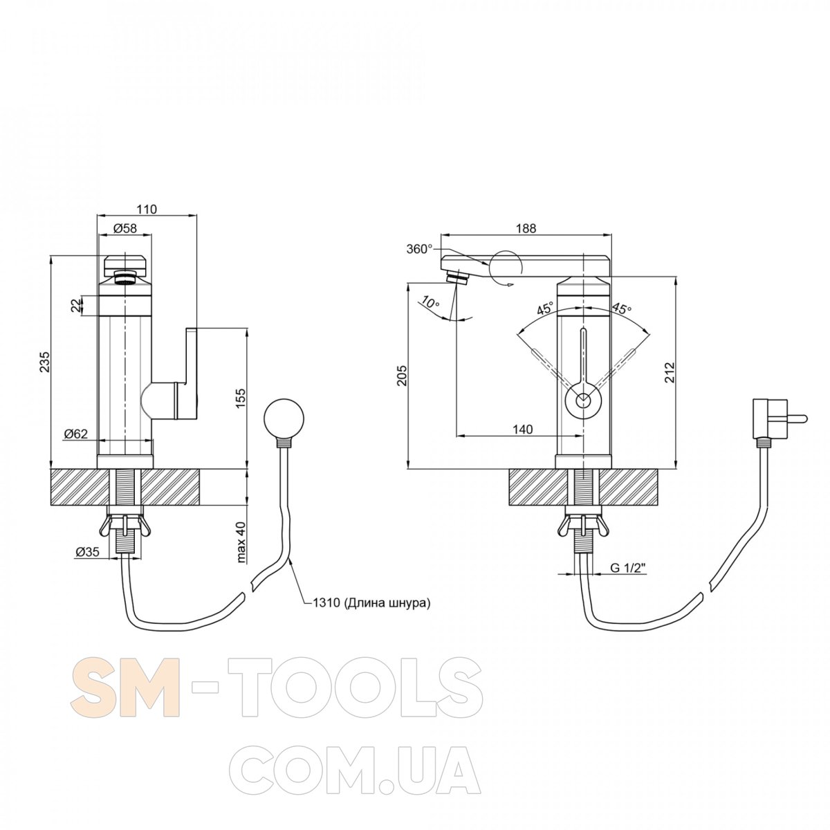 Высота излива, мм 205