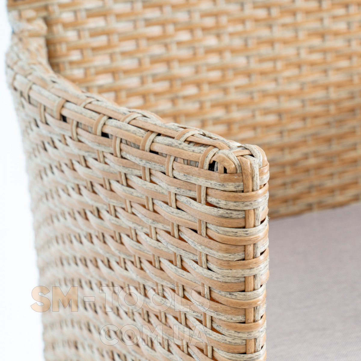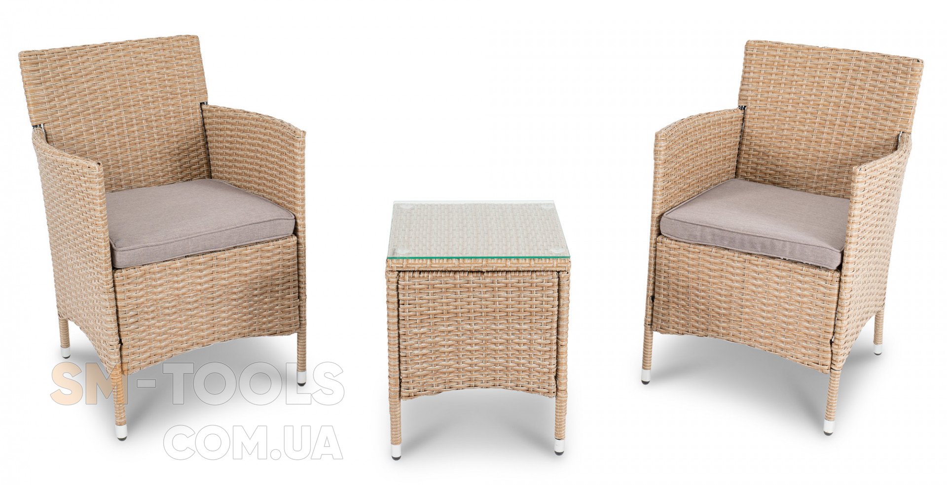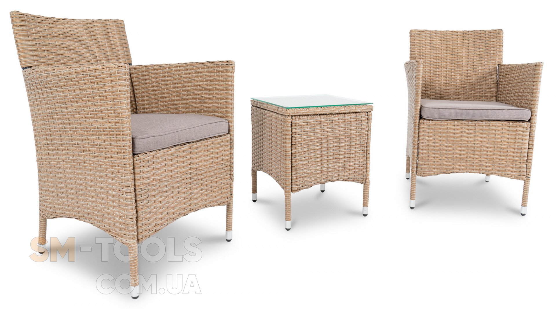 Основание комплекта изготовлено из прочной стали, которая обеспечивает всему набору надежную защиту от преждевременной коррозии и гарантирует длительный срок службы. Верхняя обивка, сделанная из добротного ротанга, прекрасно противостоит палящему солнцу, сильным дождям и любым другим погодным условиям. Также наружное покрытие хорошо справляется с загрязнениями и очень просто в уходе.