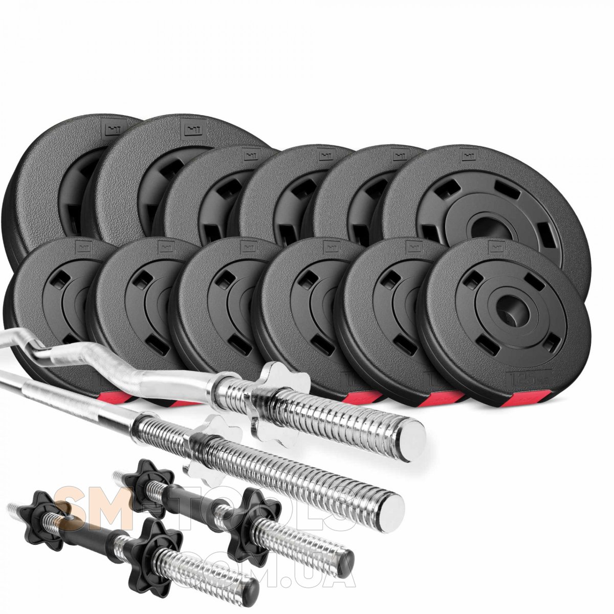 Благодаря тщательно подобранной конфигурации и высококачественным компонентам этот набор будет оценен как начинающими, так и опытными пользователями. Диски для штанги покрыты несколькими слоями ABS-пластика, чтобы они не повредили пол.