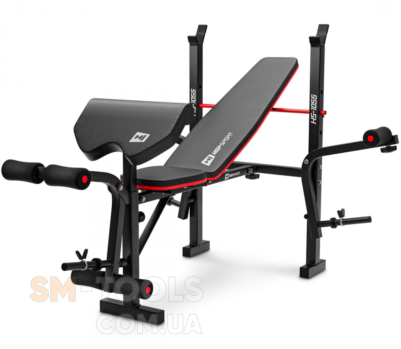 Тренировочная скамья HS-1055 предназначена для тренировок со штангой или гантелями. Широкий выбор вариантов упражнений на скамье дополняется жимом ногами. Скамья позволяет тренировать мышцы груди, рук, трицепсов, предплечий, плечевого пояса и ног. Скамейка отличается добротностью исполнения. Прочные стальные профили обеспечивают полную безопасность во время тренировок, а благодаря порошковой покраске металлических элементов конструкция сохранит эстетичный вид на долгие годы использования. Модель HS-1055 оснащена регулируемой партой Скотта, спинкой и фиксаторами для ног.
