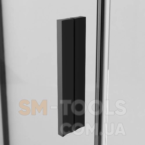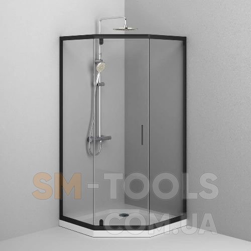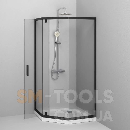 Душевое ограждение Gem пятиугольной формы с одной открытой дверью. Профиль алюминиевый, цвет чёрный, прозрачное стекло 5 мм.