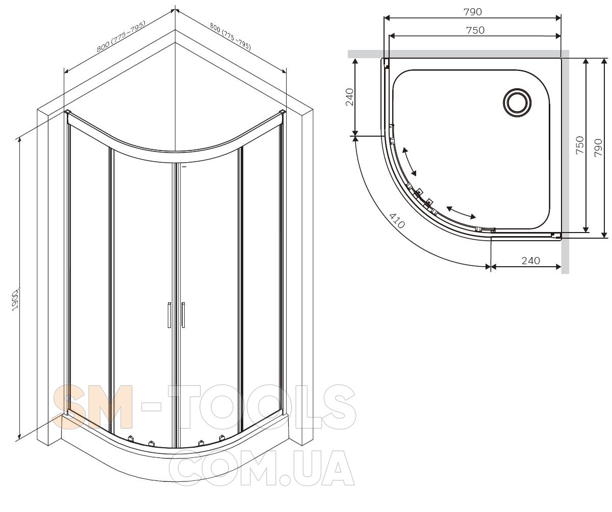 Характеристики Душевая кабина AM.PM Gem 1/4 Round 80x80 W90UG-401-080MT: