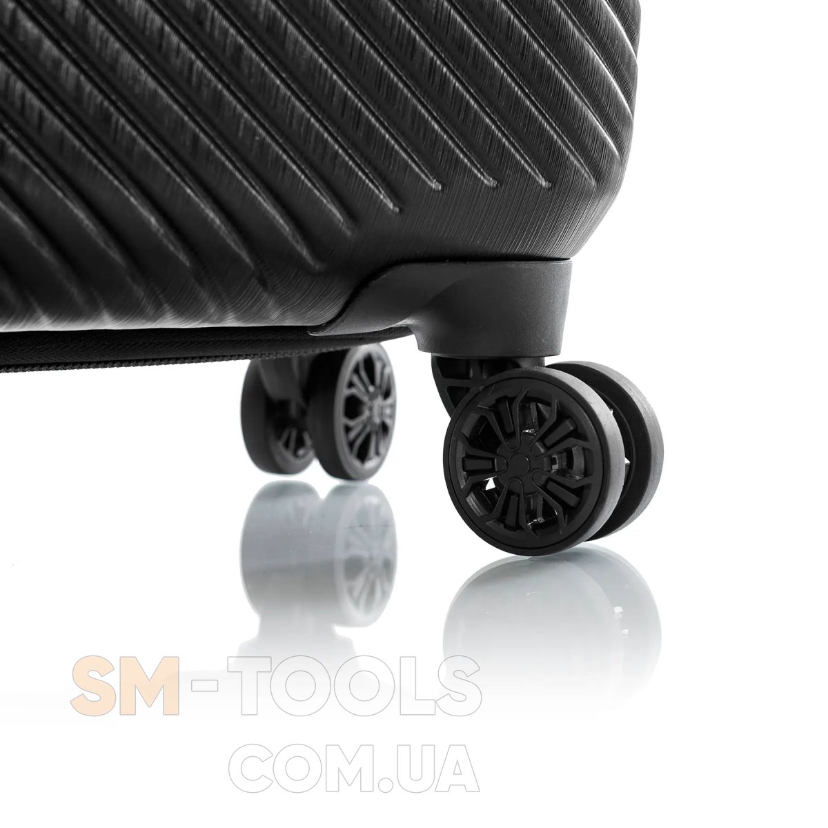 Чемодан оснащен четырьмя полноповоротными колесами системы Spinner с возможностью независимого разворота каждого колеса на 360°. Системой предусмотрено равномерное перераспределение нагрузки на каждое колесо, что в свою очередь способствует плавному качению и маневренности чемодана, прилагая при этом минимум усилий.