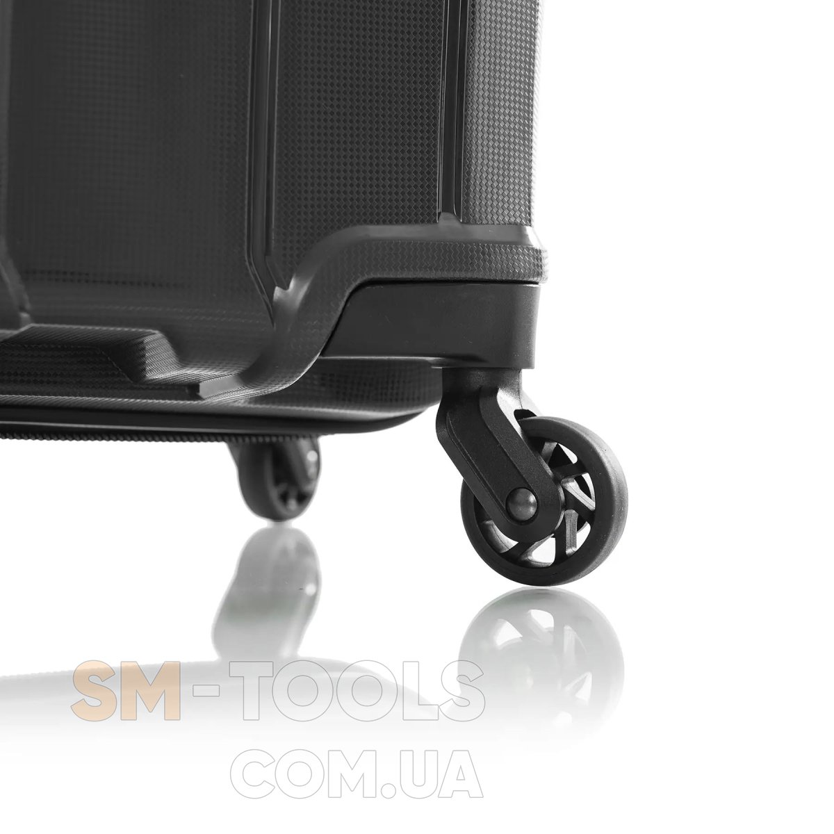 Чемодан оснащен четырьмя полноповоротными колесами системы Spinner с возможностью независимого разворота каждого колеса на 360°. Системой предусмотрено равномерное перераспределение нагрузки на каждое колесо, что в свою очередь способствует плавному качению и маневренности чемодана, прилагая при этом минимум усилий.