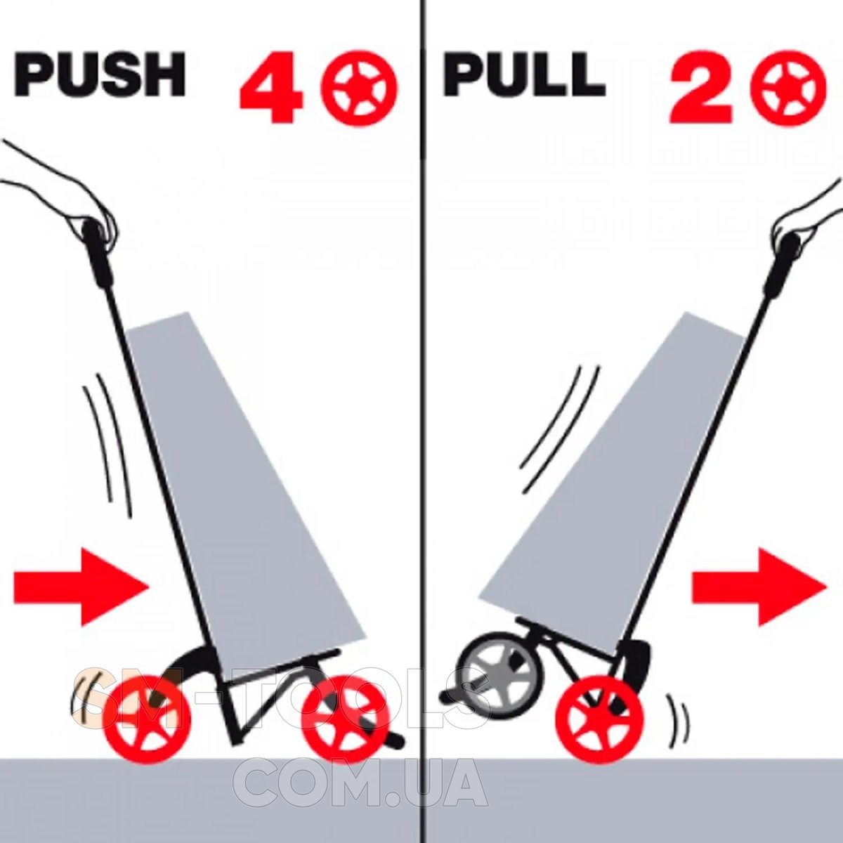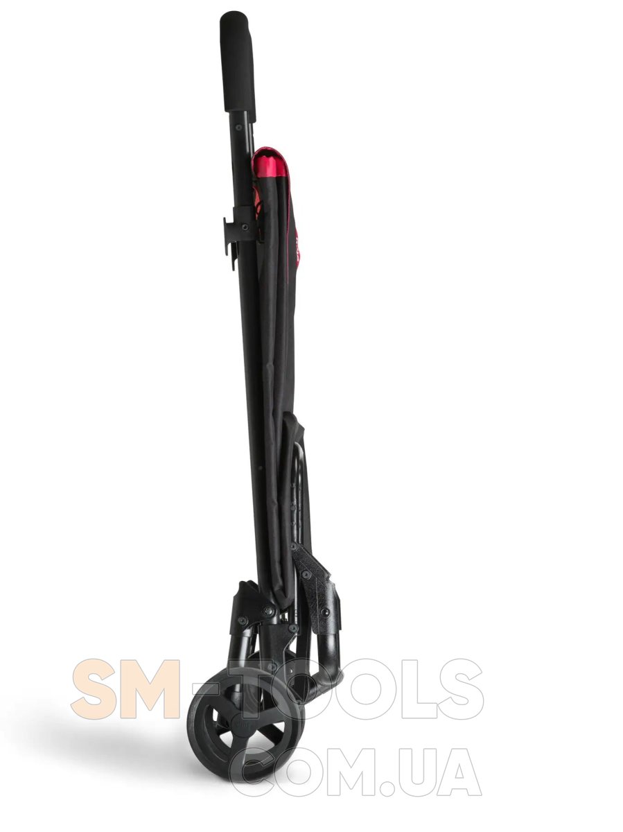 - Шасси сумки-тележки оснащено четырьмя колесами. Шасси складывается и раскладывается таким образом, что можно использовать либо одну, либо обе пары колес одновременно.