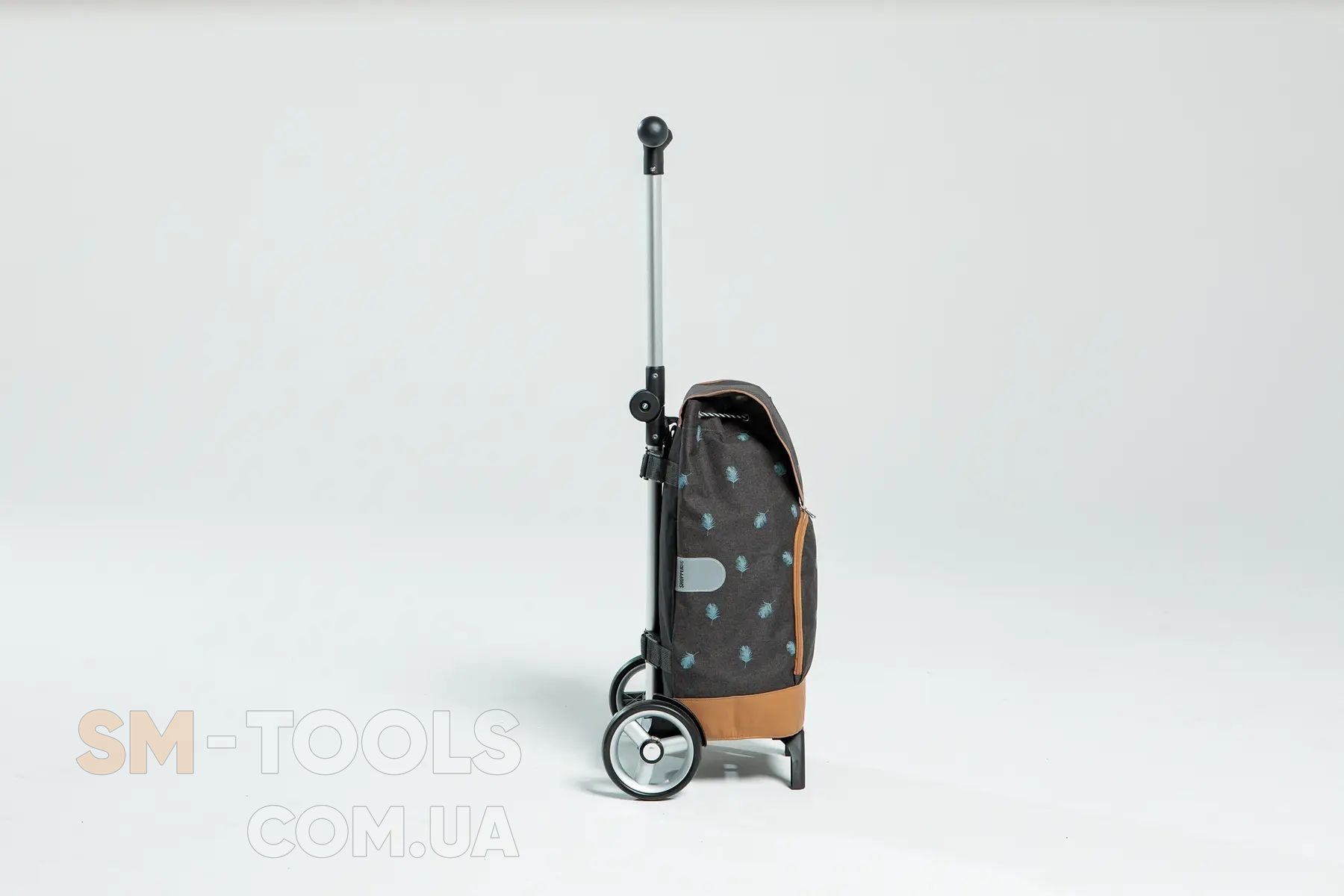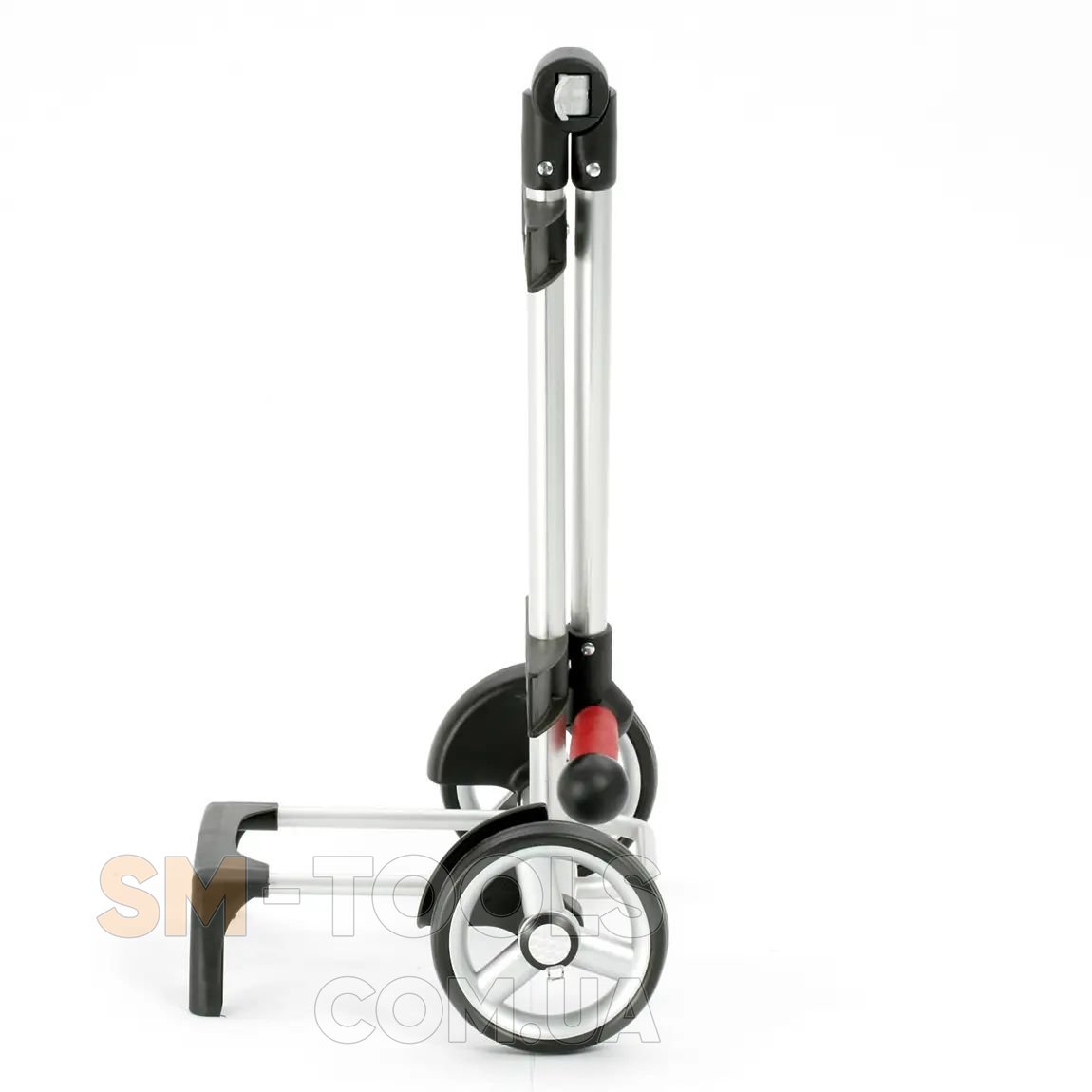 - Тележка оснащена телескопической ручкой, что позволяет вдвое уменьшить высоту конструкции и фиксировать ручку на любую высоту.