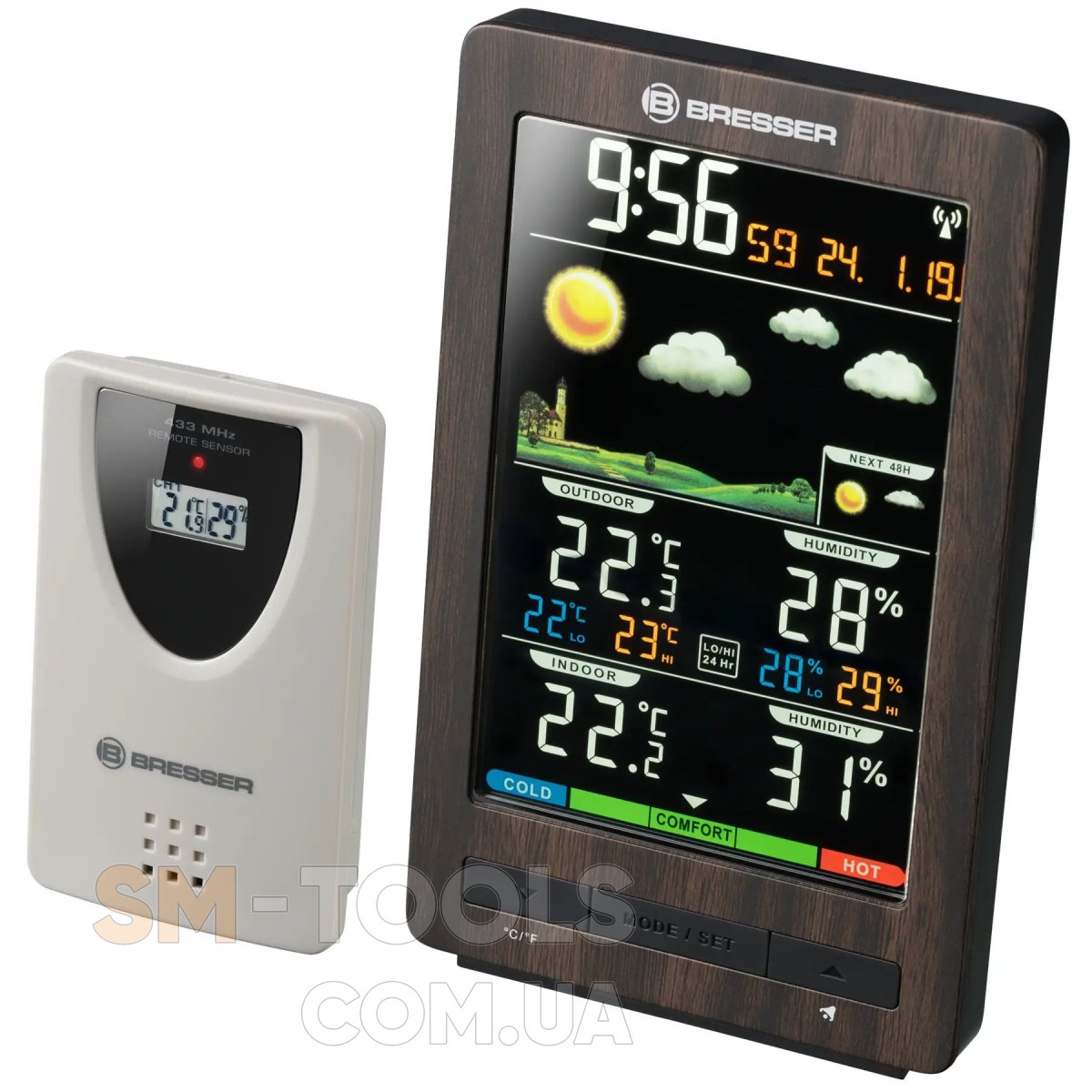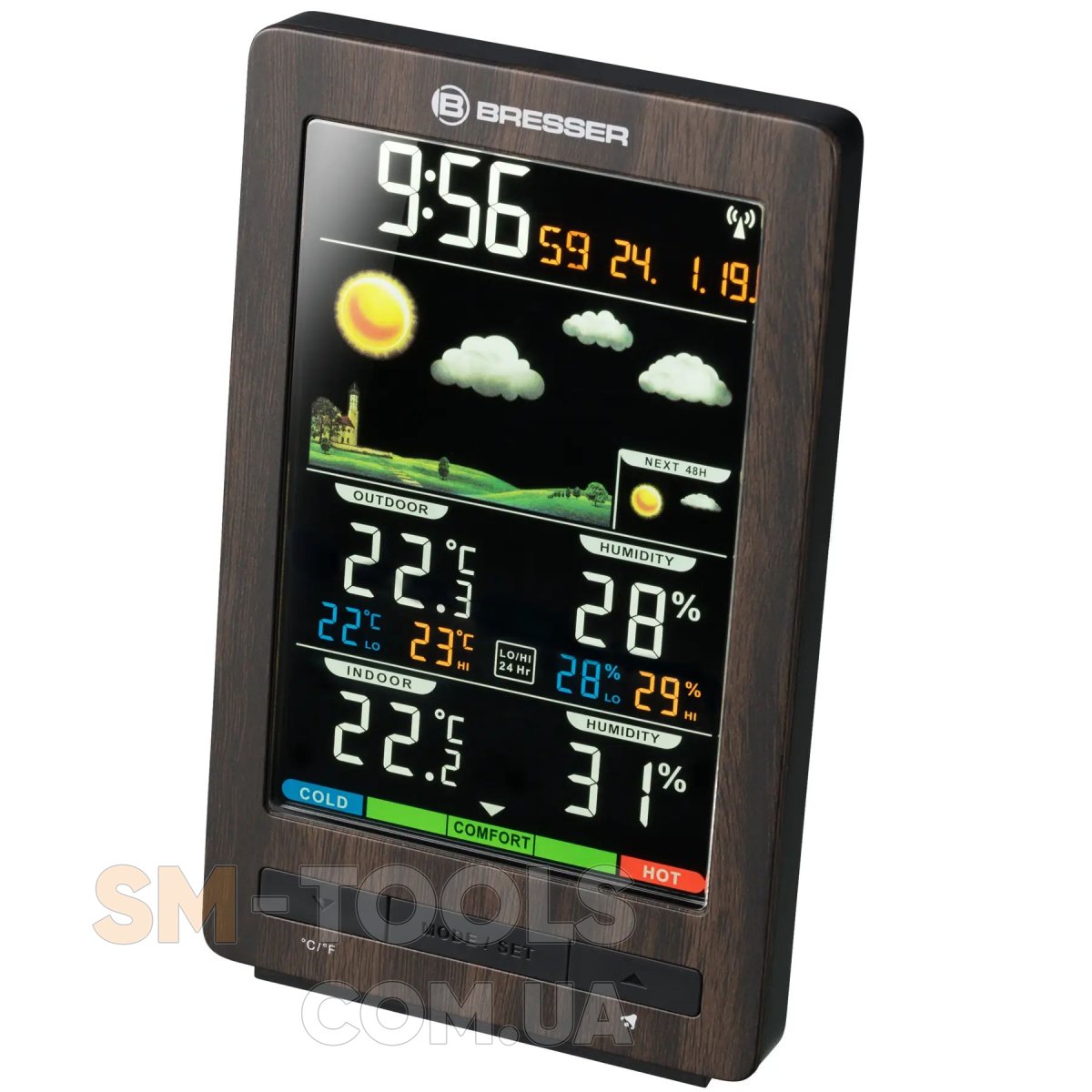 Стильная метеостанция с прогнозом погоды Bresser ClimaTemp WS обеспечивает измерение таких важных метеопараметров как температура и относительная влажность воздуха внутри и снаружи помещения, уровень комфорта в помещении. Цветной дисплей с яркой LED подсветкой имеет широкий угол обзора и высокий контраст в любое время суток.