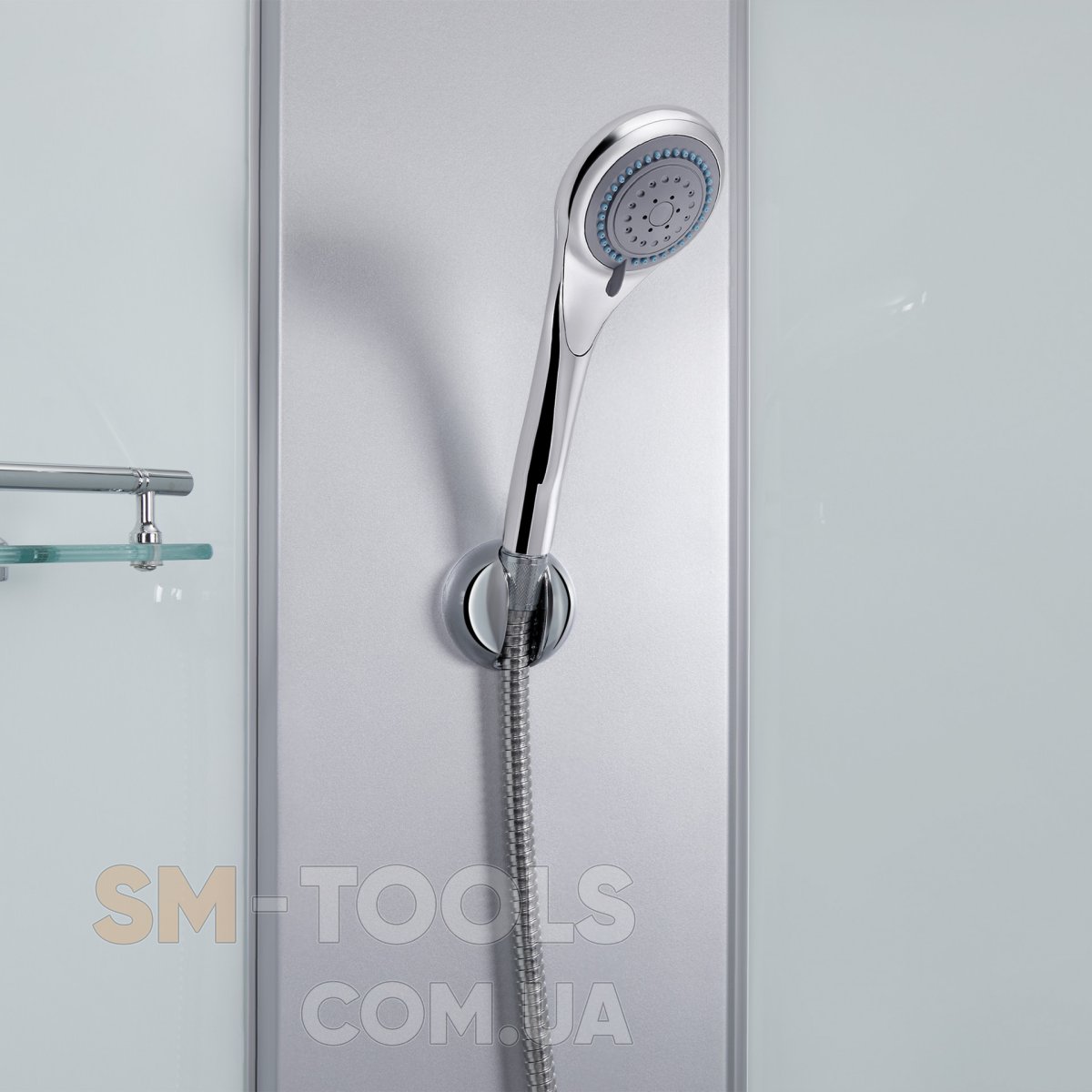 Ручки, двойные ролики, профиль, комплект крепежей, задняя стенка, глухое стекло, стеклянные двери, душевая панель, смеситель, лейка для ручного душа, лейка для верхнего душа, душевой шланг, кронштейн, верхняя крышка, стеклянная полка.