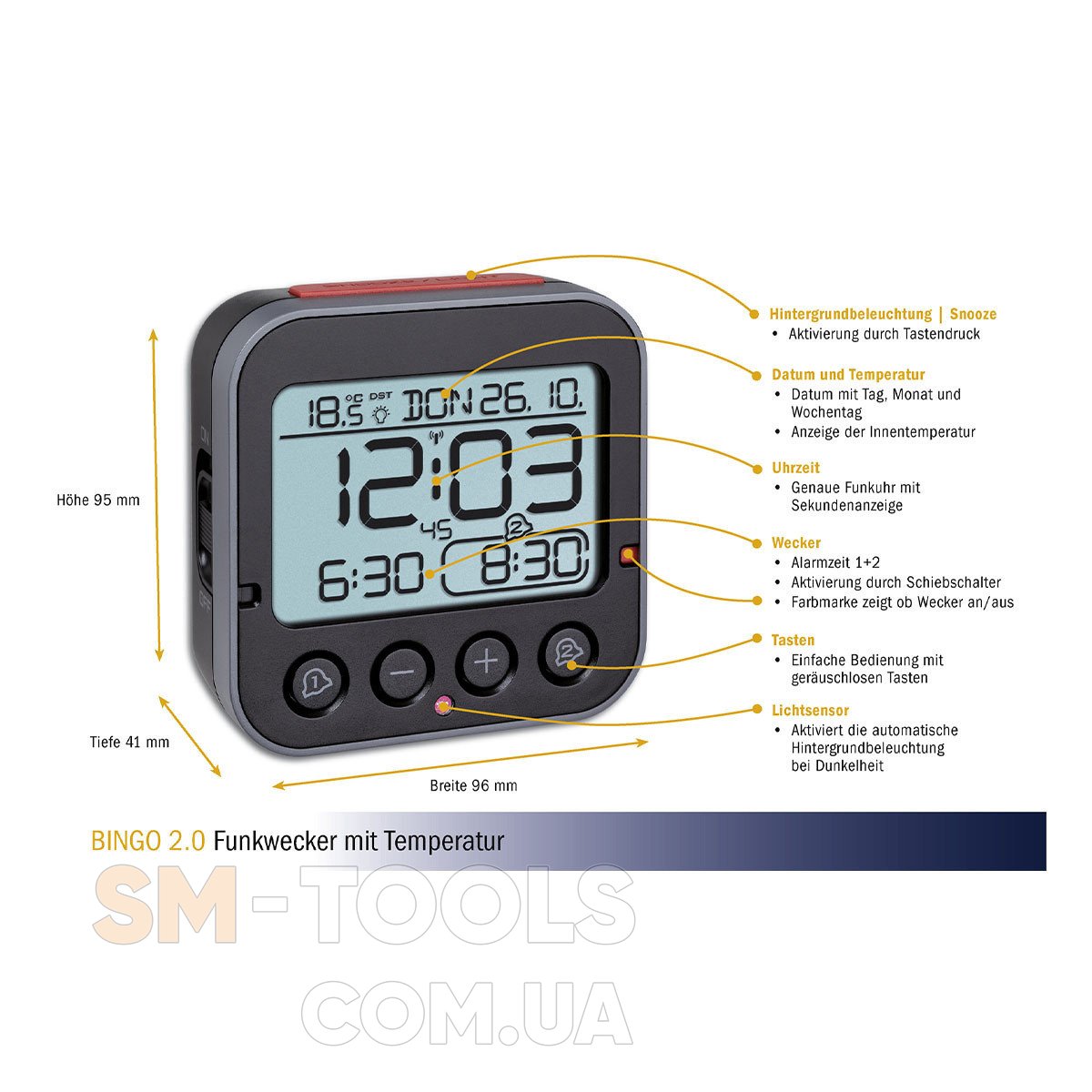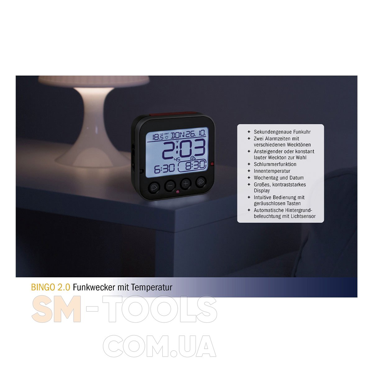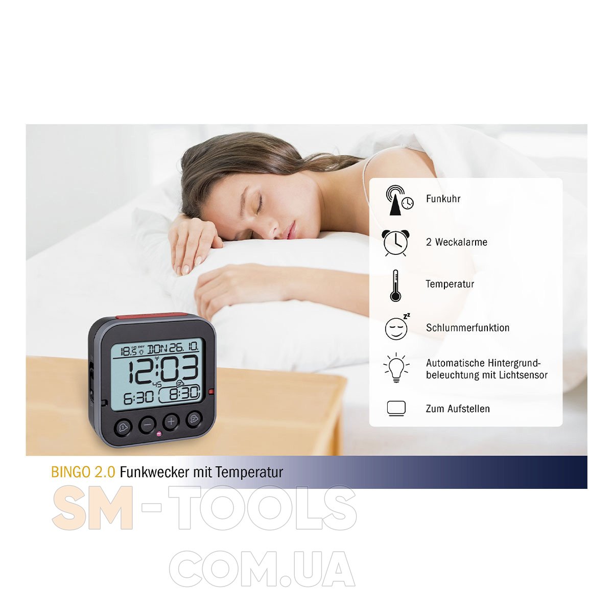 Цифровой беспроводной будильник с температурой BINGO 2.0. С этим будильником вы скажете лото! Радио-будильник с расширенными функциями, но без лишних уловок. Радио-будильник BINGO 2.0, как и его младший брат BINGO, интуитивно понятен и прост в использовании. Большой высококонтрастный дисплей еще четче и удобен для чтения даже в темноте. Если вы нажмете большую красную кнопку в верхней части будильника, он кратковременно загорится ярко. Если вы хотите видеть время всю ночь, вы также можете выбрать ненавязчивое и экономичное ночное освещение, которое включается и выключается автоматически через встроенный датчик освещенности. Два времени будильника с разными звуковыми сигналами могут быть активированы независимо друг от друга. Просто сдвиньте вверх соответствующий ползунковый переключатель сбоку. Цветная отметка четко показывает, включен ли будильник. Позвольте себе мягко разбудить себя повышающимся сигналом будильника или на полной громкости. Если вы не хотите сразу вставать, воспользуйтесь функцией повтора. Кроме того, BINGO 2.0 предоставляет информацию о дне недели и дате, а также измеряет температуру в помещении.