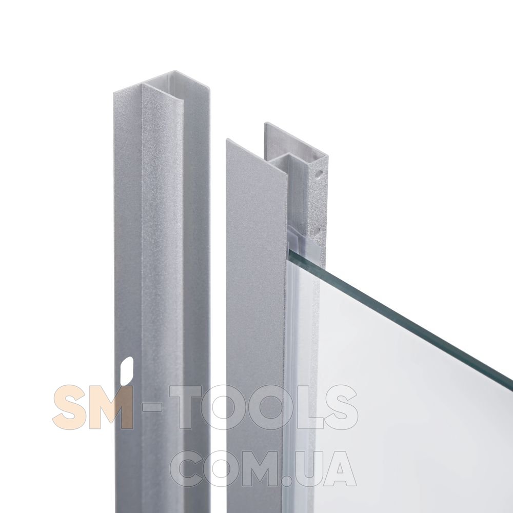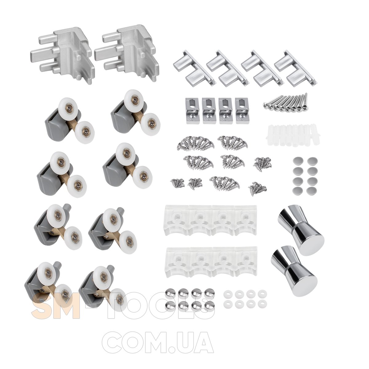 Поддон, двойные ролики, ручки, комплект крепежей, глухое стекло, стеклянные двери, соединяющий элемент, профиль, ножка.