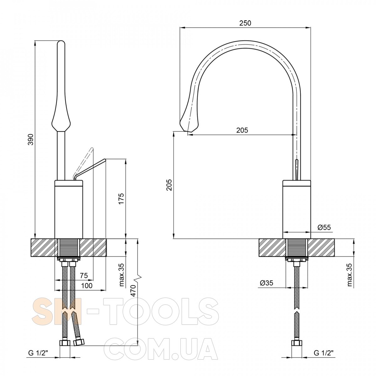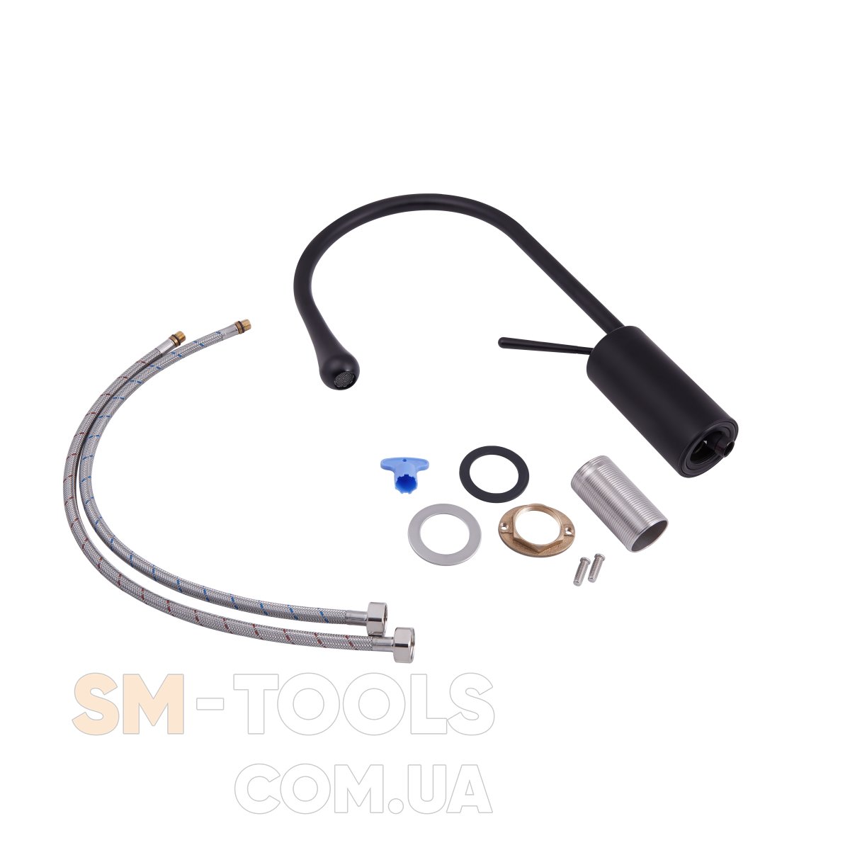 Смеситель, гибкая подводка, ключ для аэратора, крепеж.