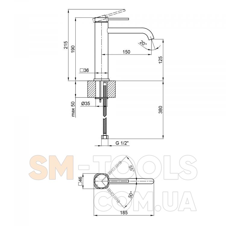 Высота излива, мм 125