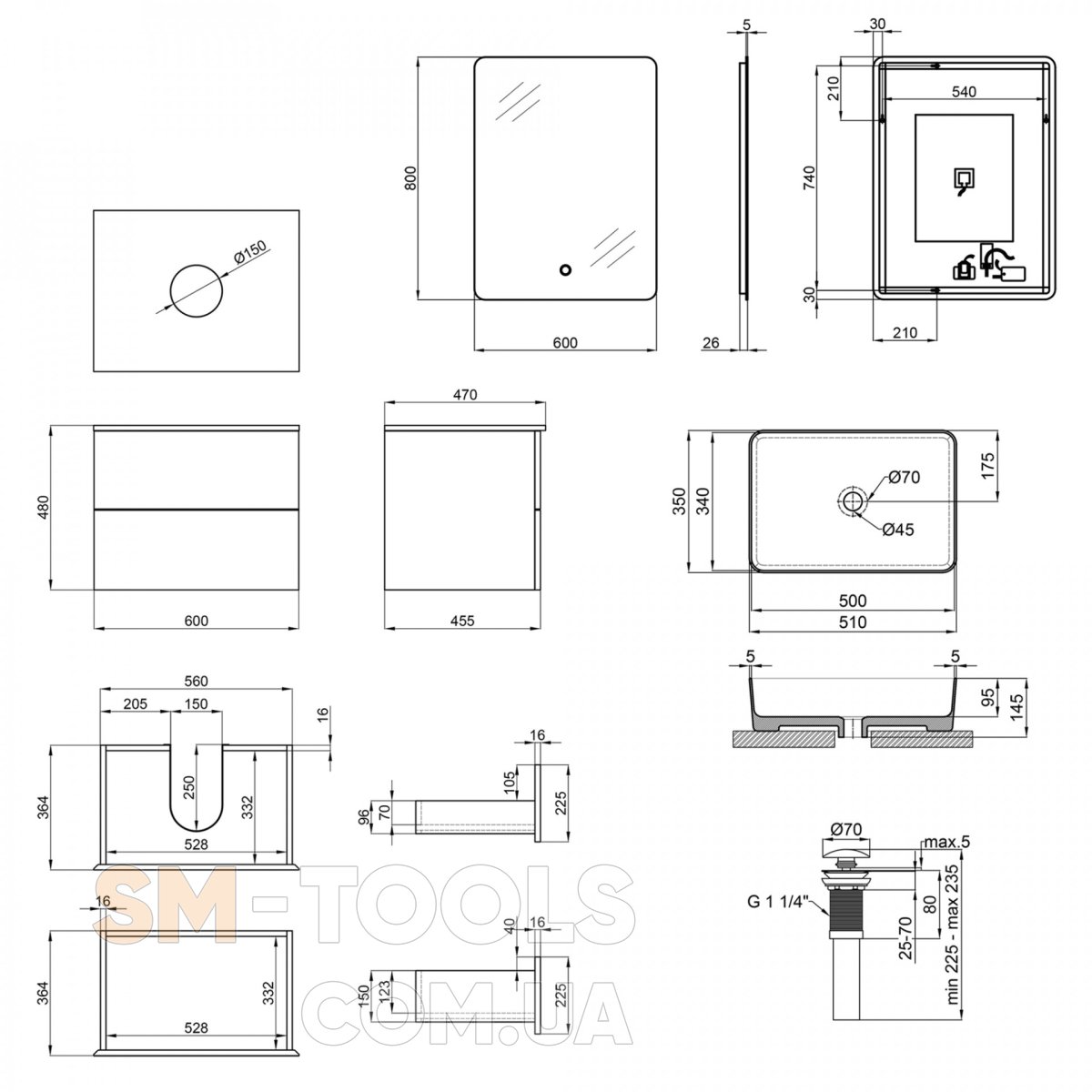 Характеристики Комплект мебели для ванной Qtap тумба + раковина + зеркало QT044VI43005: