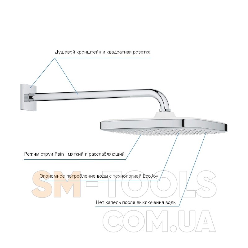 - GROHE SmartControl® инновационное управление - включается нажатием кнопки Вкл/Выкл, увеличение водного потока поворотом рукоятки от режима EcoJoy (минимальный) до Full Flow (максимальный)