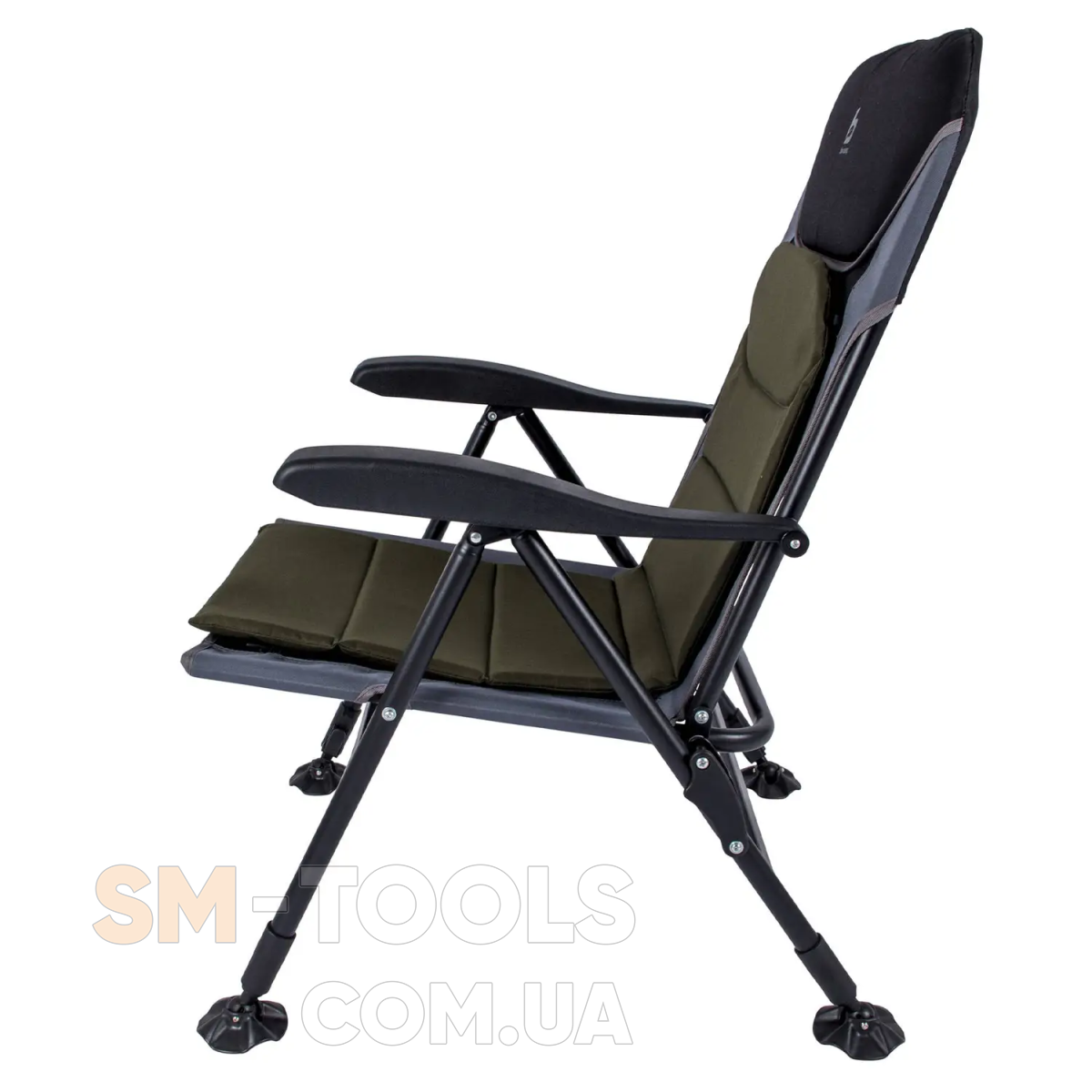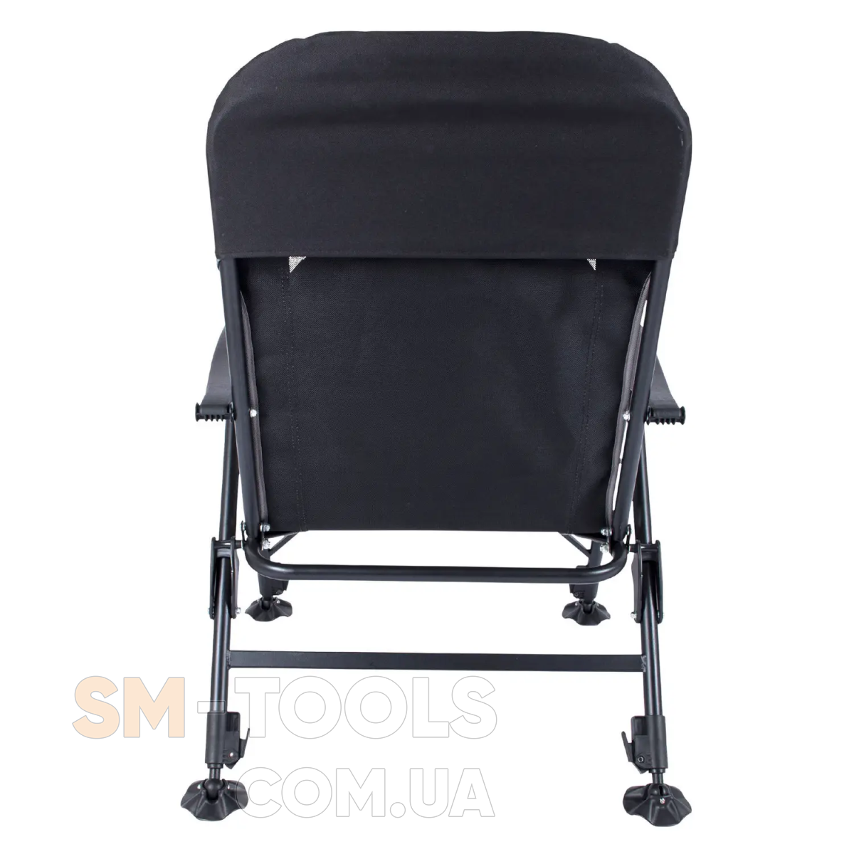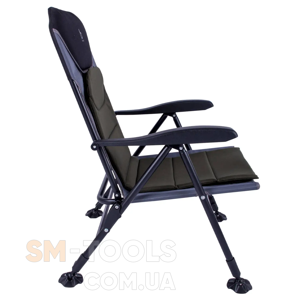 Удобство кресла во многом обусловлено разными вариантами его установки на различном рельефе. Для этого кресло имеет восемь уровней наклона спинки, бесступенчатую регулировку высоты каждой ножки по отдельности и плоские пятки, вращающиеся на шарнире. Мягкая накладка является съемной и вплне допускает использование кресла без нее. Несмотря на большие размеры, кресло достаточно компактно в сложенном виде.