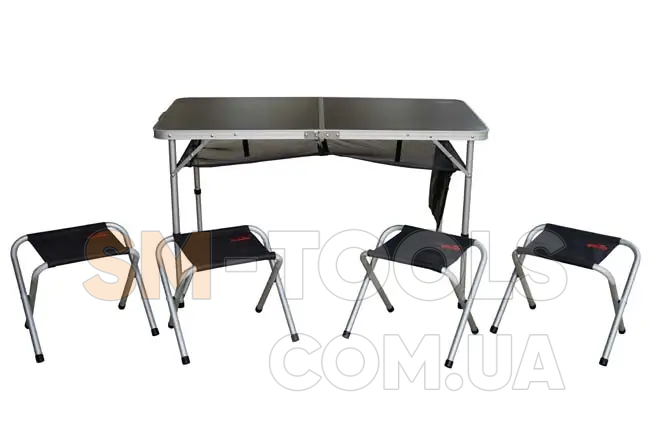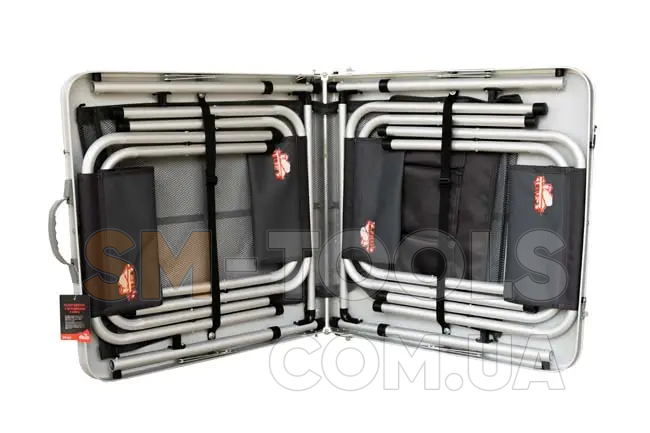 - Стулья крепятся ко внутренней стороне стола, стол складывается пополам как чемоданчик.