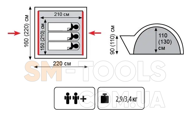 Тент: 100% полиэстер 75D/190T WR PU 4000 мм в. ст.