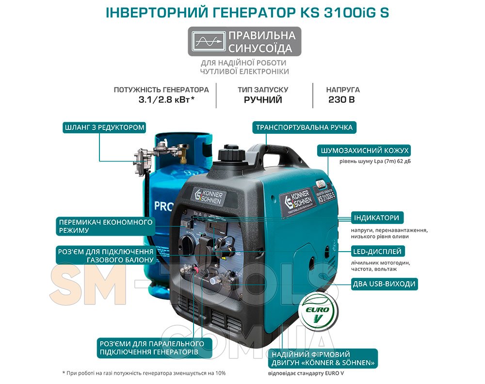 Газобензиновий генератор інверторного типу KS 3100iG S німецької торгової марки Könner&Söhnen в шумозахисному корпусі – це зручне компактне, практично безшумне джерело електроенергії. Ключова особливість даної моделі полягає в тому, що вона виробляє електричний струм з правильною синусоїдою.