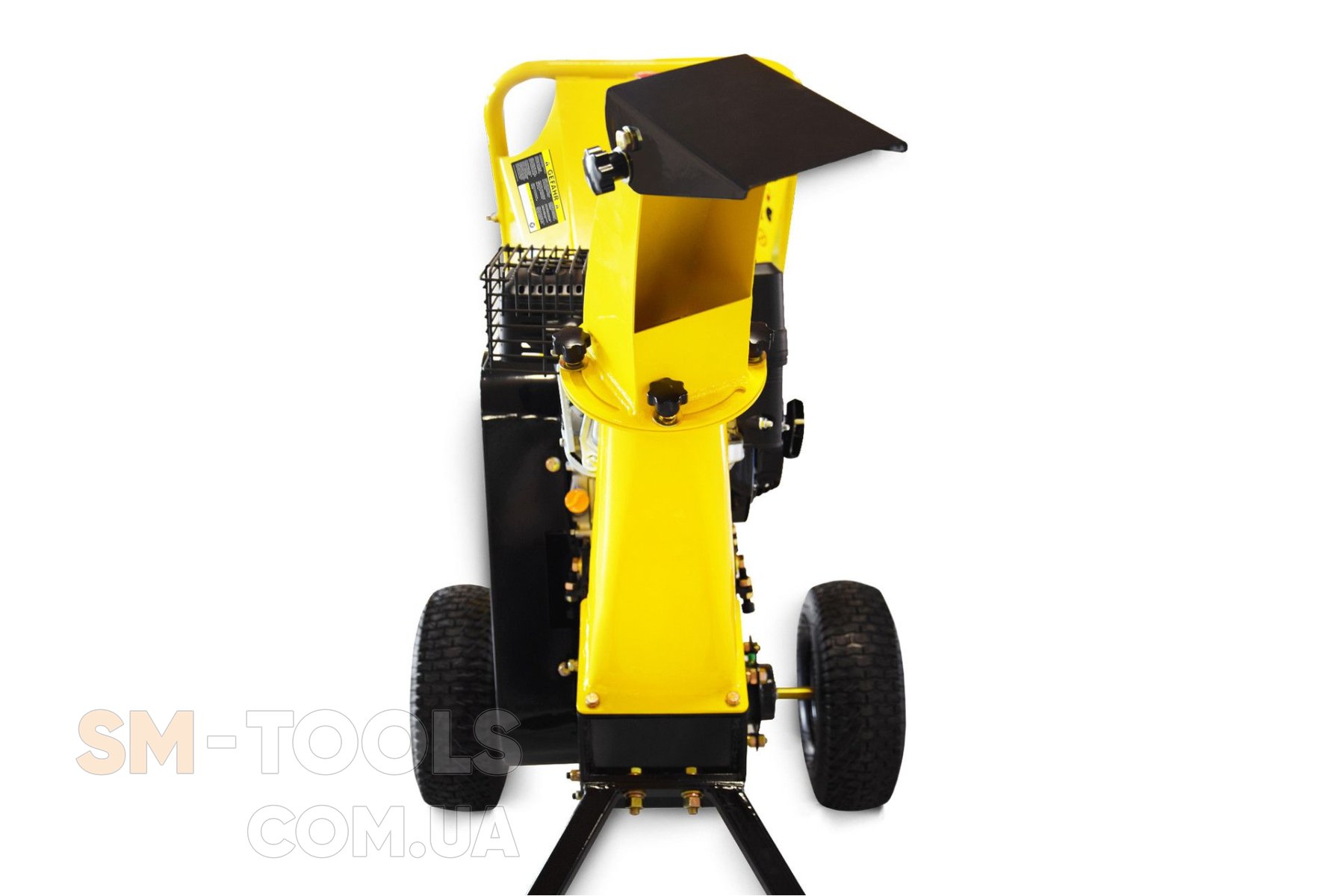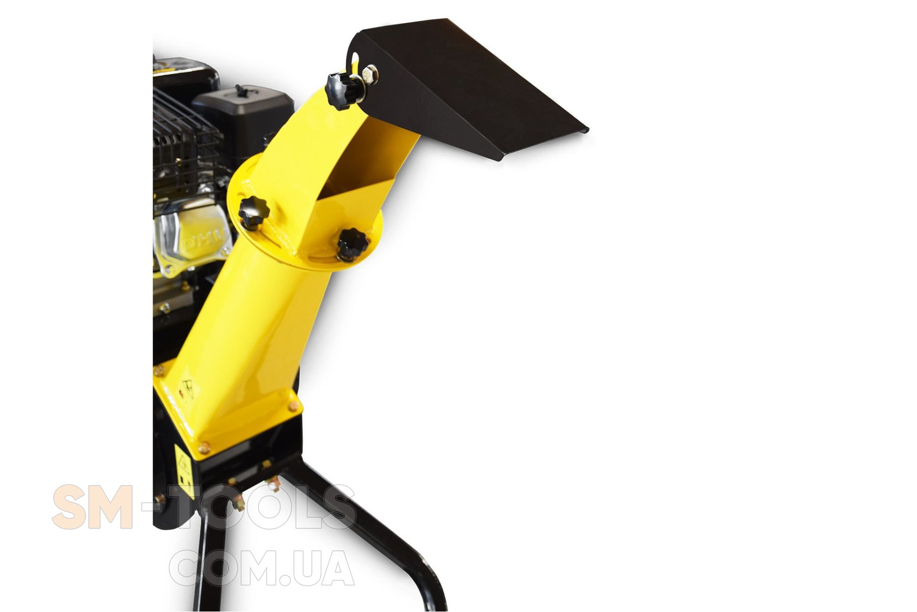 - Нож из нержавеющей стали помещается на барабан и вращается против жестового ножа, после чего измельченные ветви выбрасываются через специальный желоб, с возможностью регулировки высоты и дальности выброса.