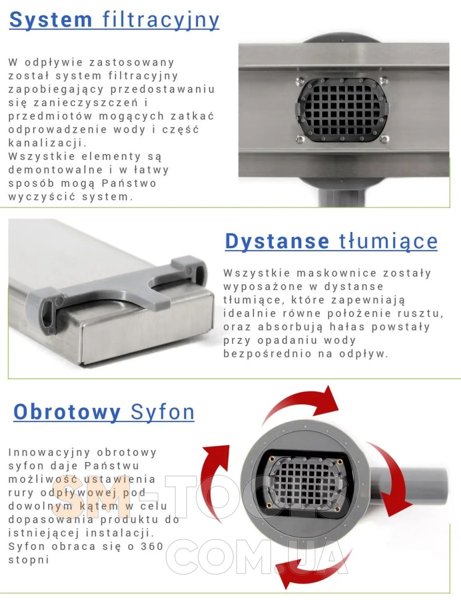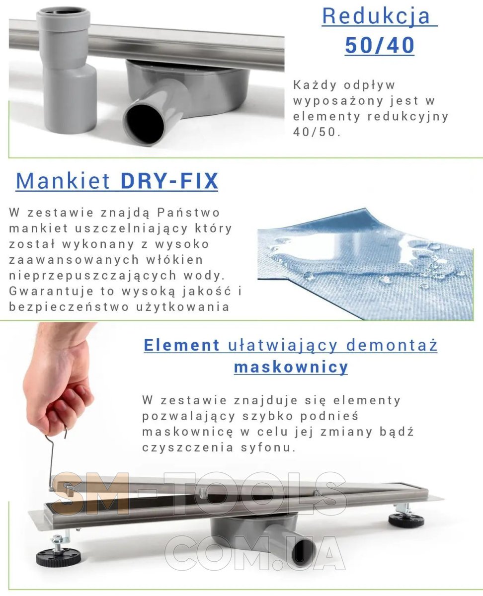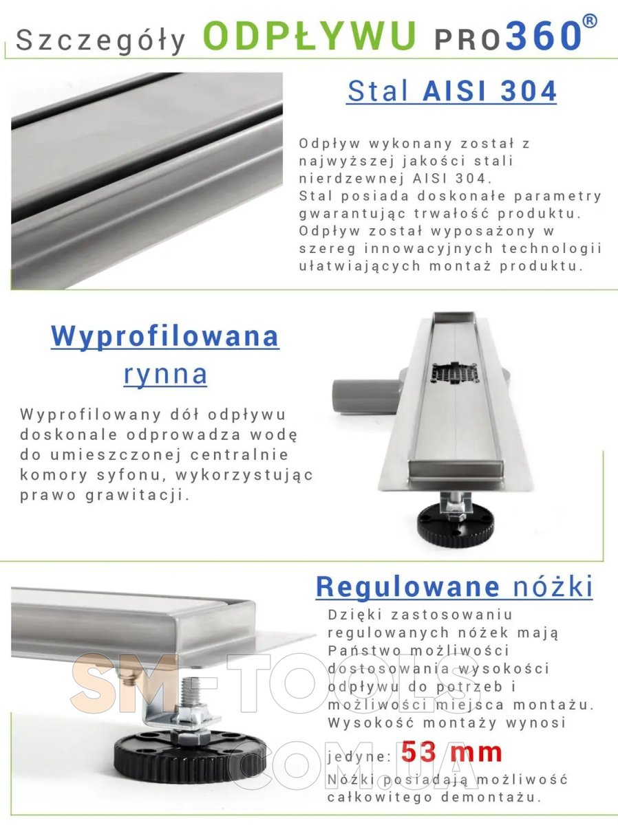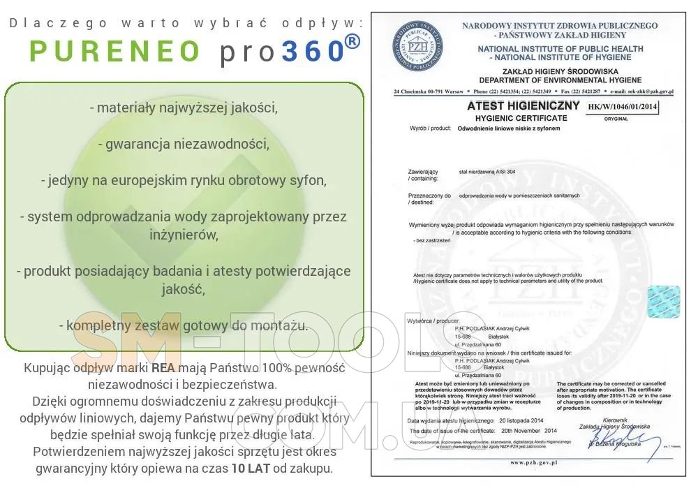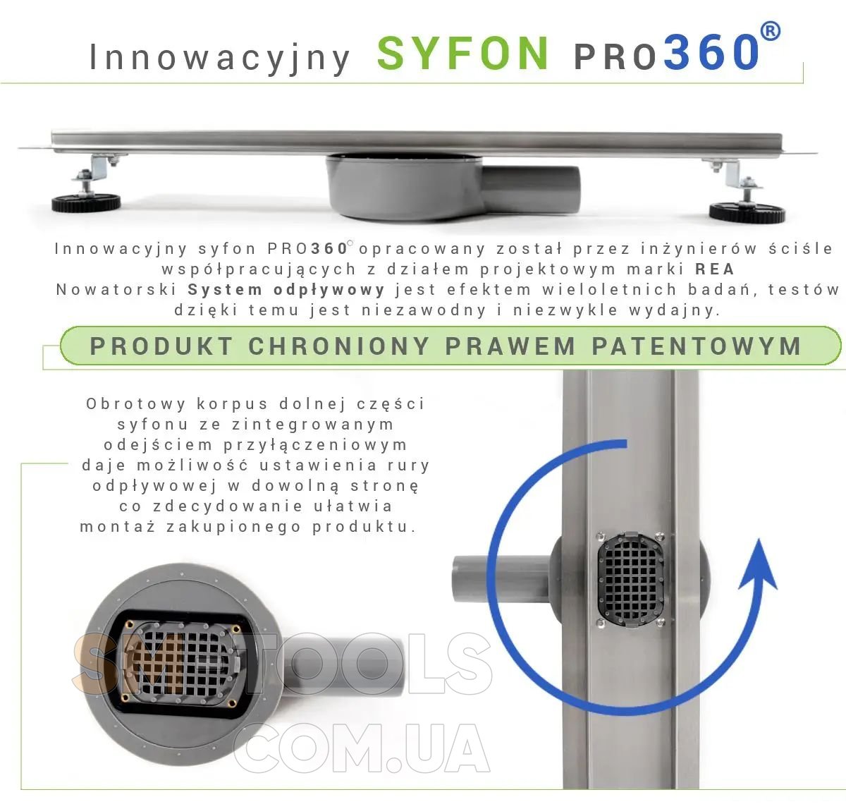 Трап Rea Pure Neo Pro - один из наших лучших линейных сливов, изготовленный из высококачественной нержавеющей стали Aisi 304. Сифон в сливе Pure Neo Pro вращается (диапазон 360 градусов), мы можем установить его на сливные трубы в нестандартное место. Крышка водостока Pure Neo Pro двусторонняя, поэтому мы можем выбрать два варианта отделки - алюминий или наклеенная плитка, что позволяет подобрать тип отделки для каждой ванной комнаты. Трап Pure Neo Pro доступен в шести размерах, чтобы идеально подходить к душевой кабине или душевой двери.