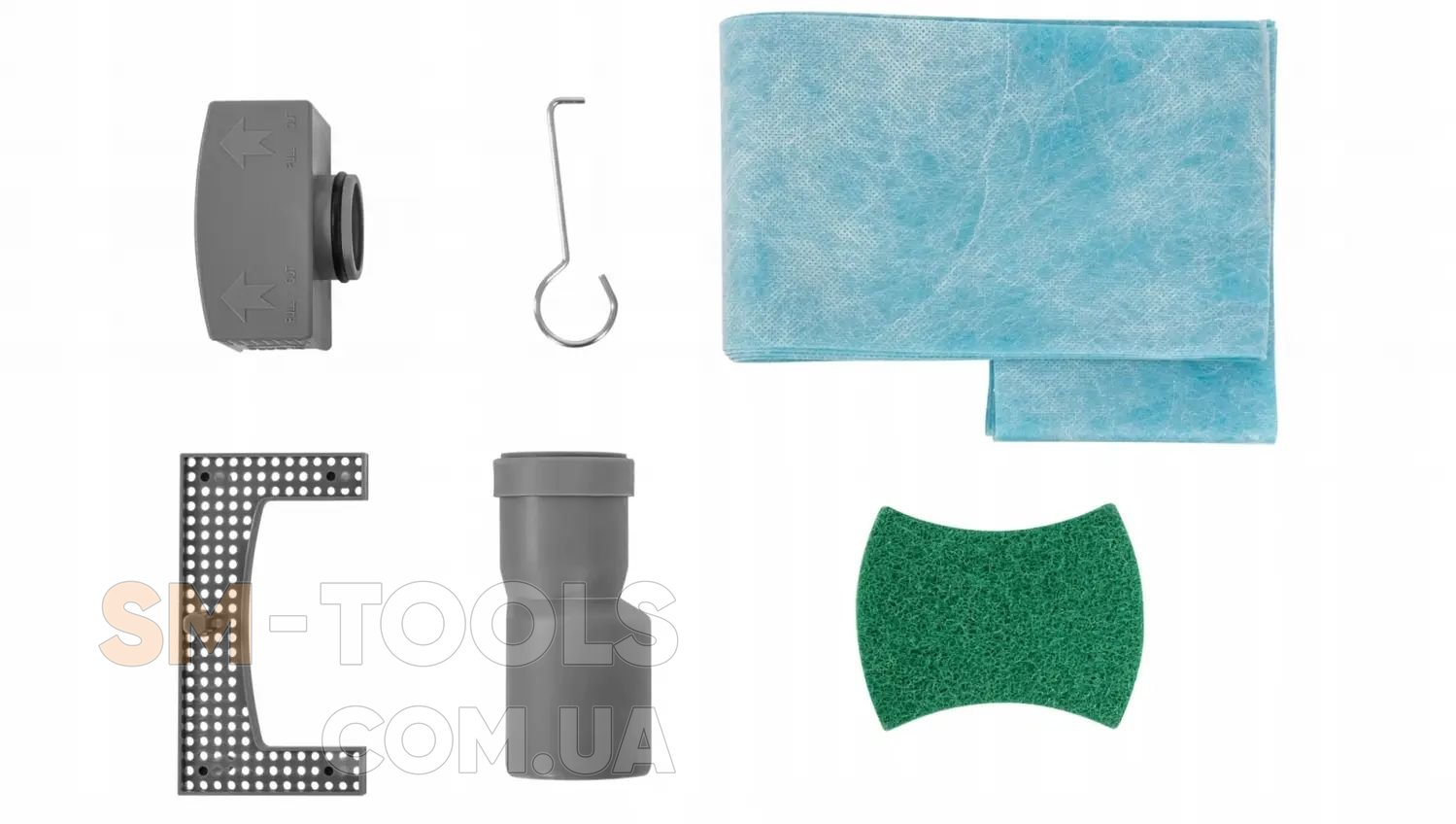 Регулируемые ножки, сифон, манжет Dry-Fix, фильтр-корзина, инструкция по эксплуатации, губка, крючок