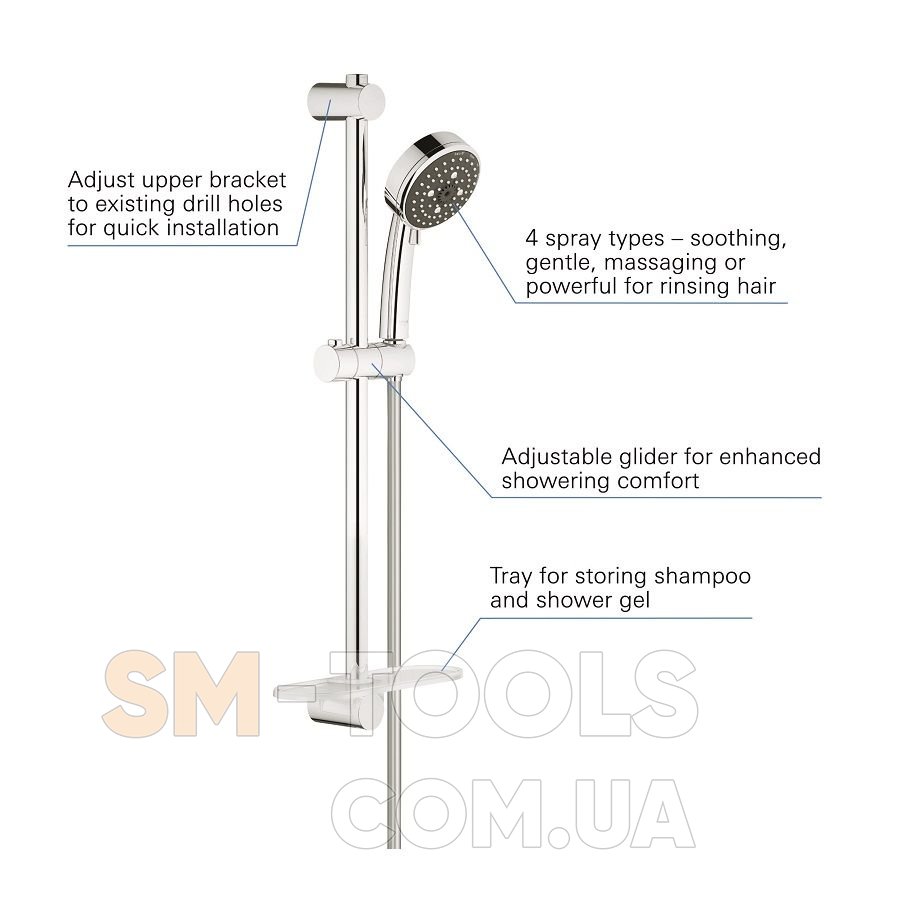 Душевой гарнитур Grohe Vitalio Comfort 100 26098000Душевой набор GROHE Vitalio Comfort 100 обладает всеми качествами, которые помогут вам испытать опыт, схожий со SPA-процедурами - но только прямо у вас в душе.