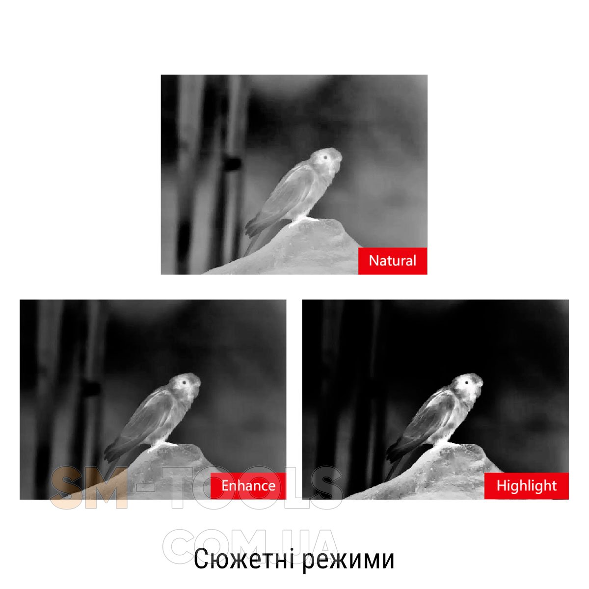 Для эффективного обнаружения цели в тепловизионном монокуляре Guide TA425 предусмотрено четыре варианта цветовых палитр: White Hot, Black Hot, Red Hot, Green Hot, и три вида сюжетных режимов – Enhanced, Highlight, Natural.