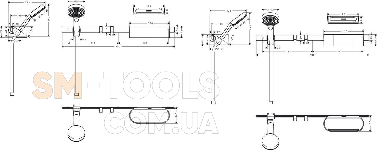 Состоит из: ручной душ, душевой шланг, настенная рейка, корзина для хранения, резиновая щетка, ползунок, резиновая щетка