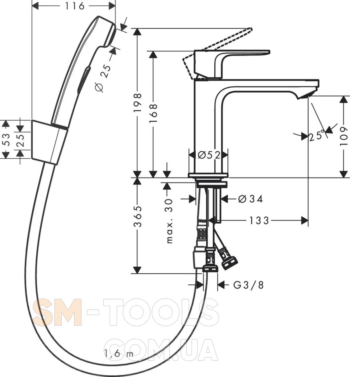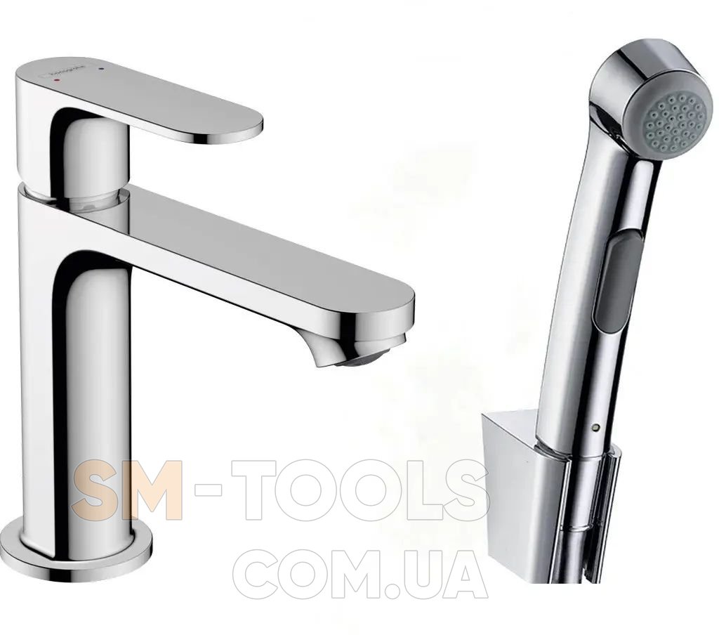 Состоит из: однорычажный смеситель для раковины, ручной душ-биде, держатель для душа, душевой шланг