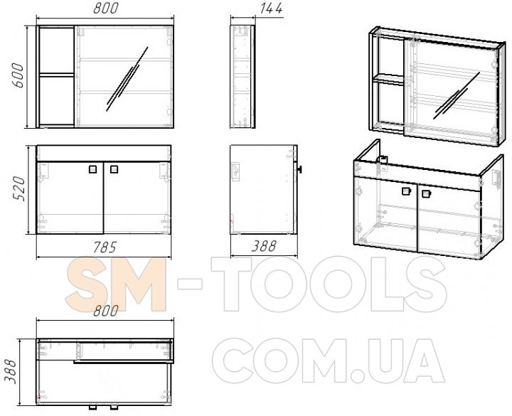 - Зеркальный шкаф: 80 х 60 х 14.4 см