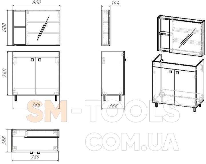 - Комплектация: тумба с раковиной, зеркальный шкаф