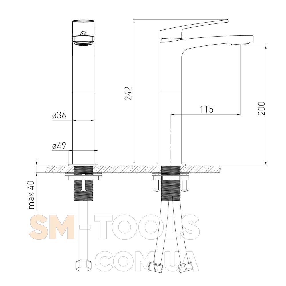 В комплект входят гибкие шланги для подключения воды с накидной гайкой 1/2", длина 50 см