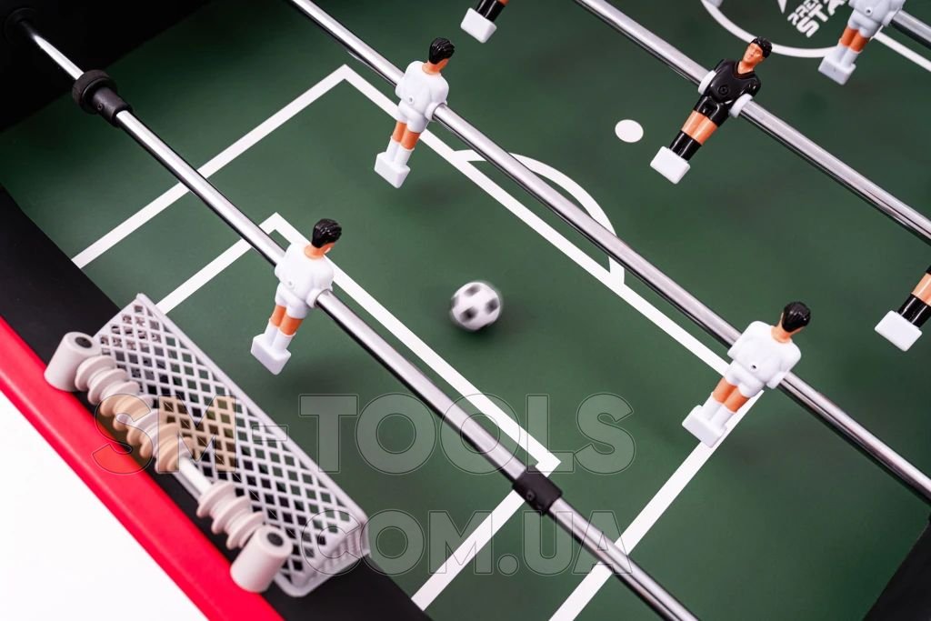 Игровое поле зеленого цвета - такое нейтральное покрытие не отвлекает игроков. Поле изготовлено из высококачественной влагостойкой плиты МДФ, покрытой слоем ламината, чтобы сделать его устойчивым к истиранию. Кроме того, углы игрового поля немного приподняты, что обеспечивает полный контроль над траекторией движения мяча. Фигурки для настольного футбола изготовлены из качественного пластика и установлены на прочных стальных направляющих, оснащенных специальными бамперами. В набор входят три мяча.