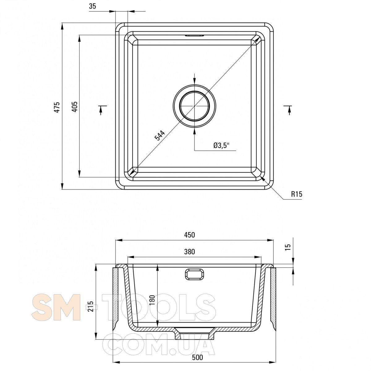 Размеры мойки 478х450x217 мм