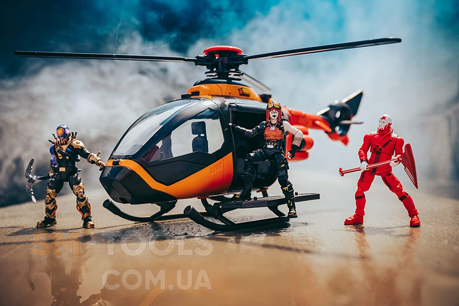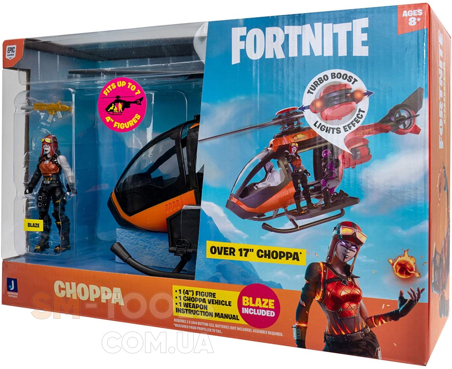 В наборе вертолет Choppa и 10 см. фигурка ”Blaze” с легендарной штурмовой винтовкой. Вертолет более 40 см. в длину, у Choppa есть место для 7 10-ти см фигурок так что вы сможете вызвать свой отряд и присоединиться к битве! Активируйте световой эффект Turbo Boost и вращайте роторы! Choppa идеально подходит для воспроизведения Fortnite в реальной жизни – куда летим?