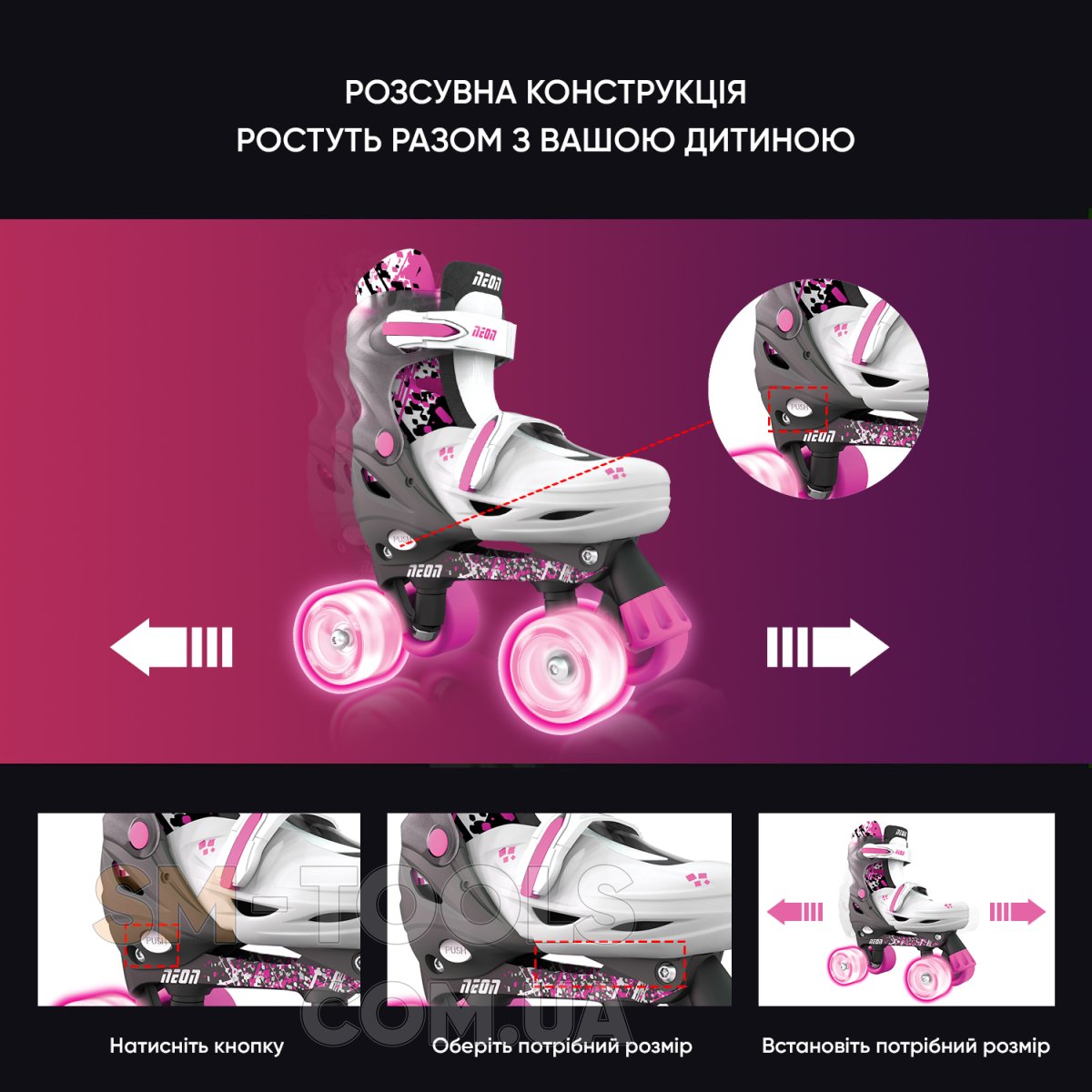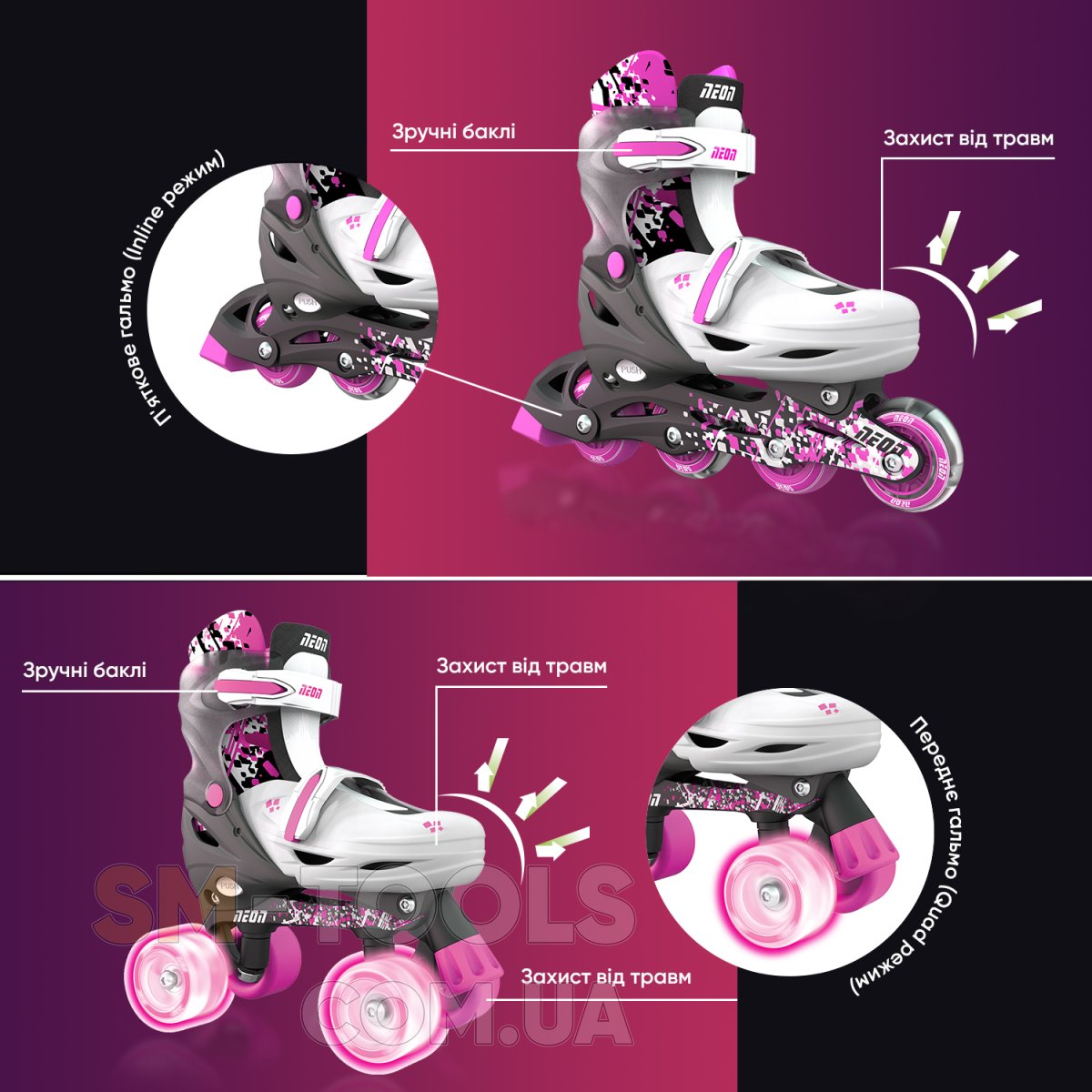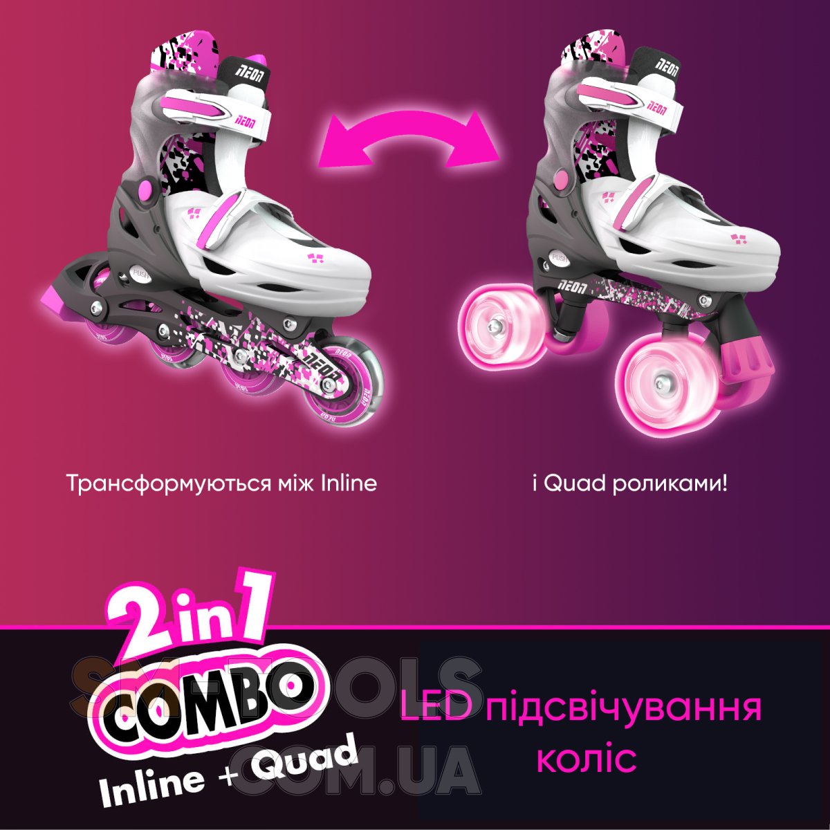 Это набор 2в1 включает в себя сразу 2 типа роликовых коньков Inline (Линейные, 4 колеса в ряд.) + Quad (по 2 колеса расположены поперечно). Именно благодаря вариативности набор Neon Combo Skates будет удобен и полезен для ребенка, которому только предстоит освоить роликовые коньки. Благодаря возможности вариативного выбора типа роликов в данной модели, обучение будет проходить наиболее продуктивно и позволит безопасно освоить ролики и используя преимущества каждого из типов.