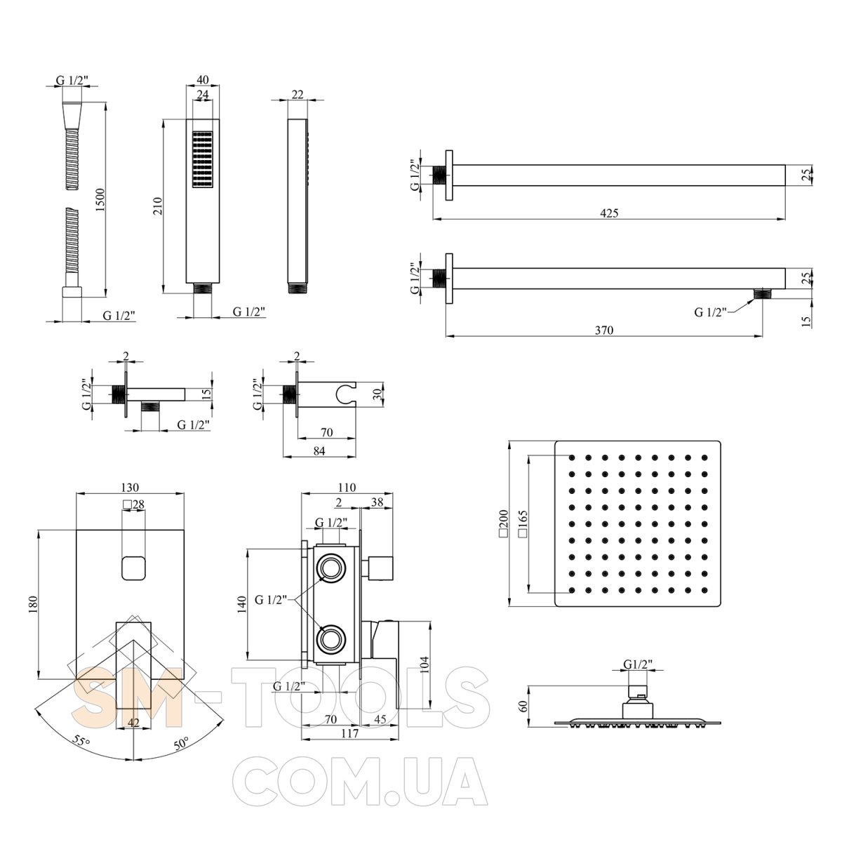 Смеситель, кронштейн для верхнего душа, лейка для верхнего душа, кронштейн для ручного душа, лейка для ручного душа, душевой шланг, крепежи, инструкция.