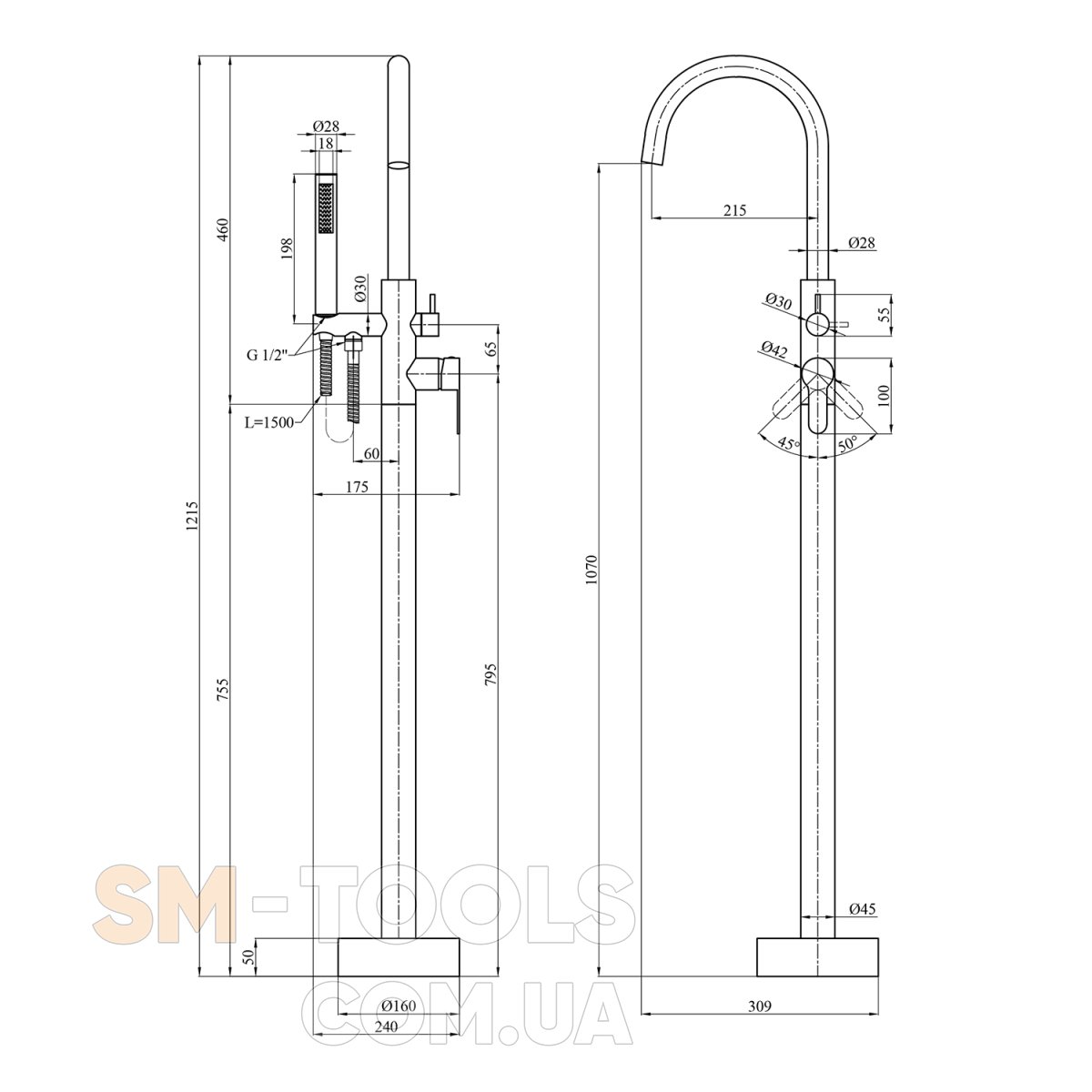Итегрированный держатель для ручного душа. Подключение душевого шланга 1/2". Однорежимная, цилиндрическая ручная лейка. Гибкие подводки 80 см.